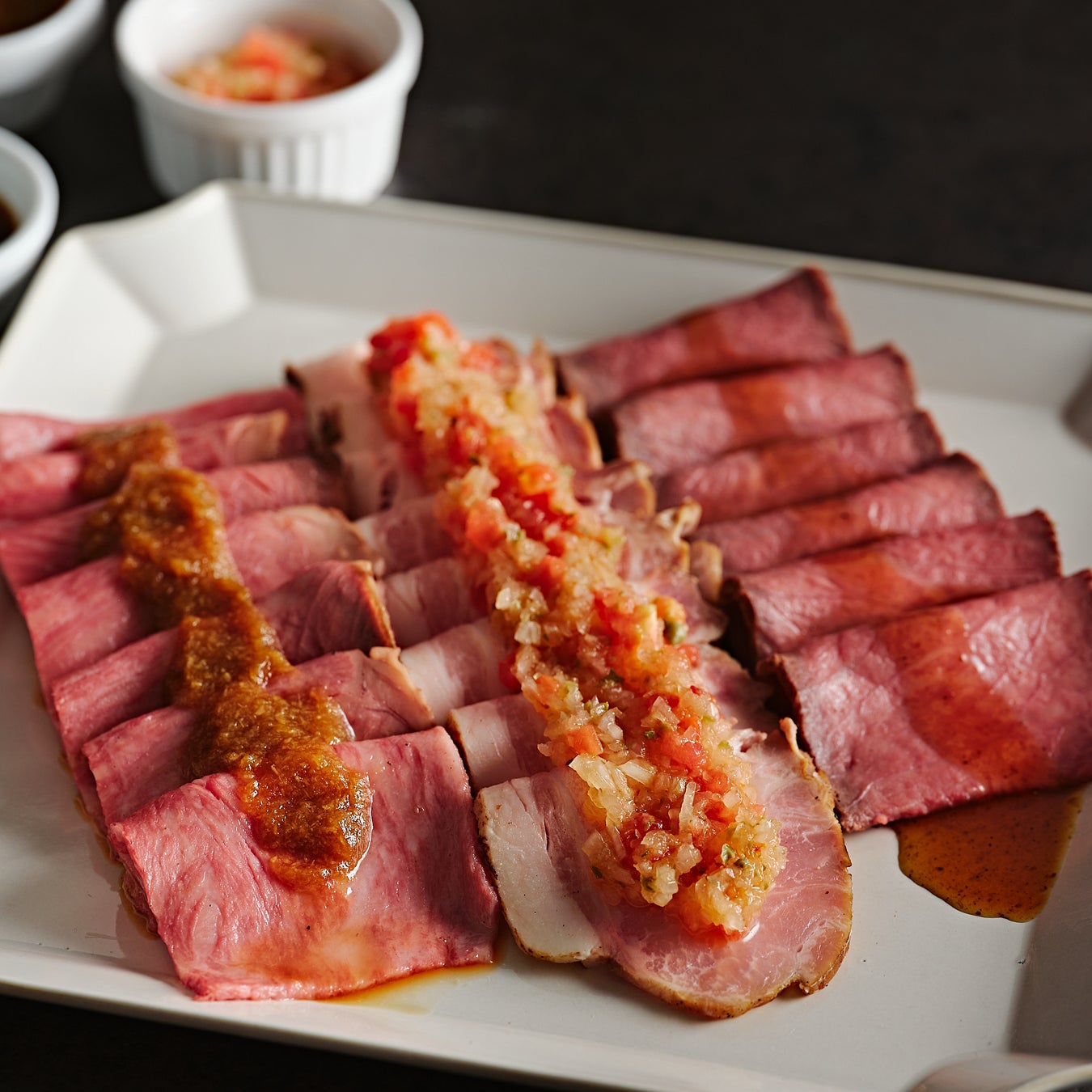 厳選した黒毛和牛と米澤豚を使用した【山笑ふ】自慢の自家製ローストビーフをそれぞれのお肉に合わせた3種類のソースで堪能できるセットです。
