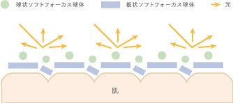 凹凸補正効果・・・光を乱反射し凹凸をぼかすソフトフォーカス粉体配合。