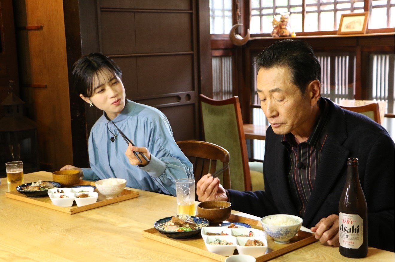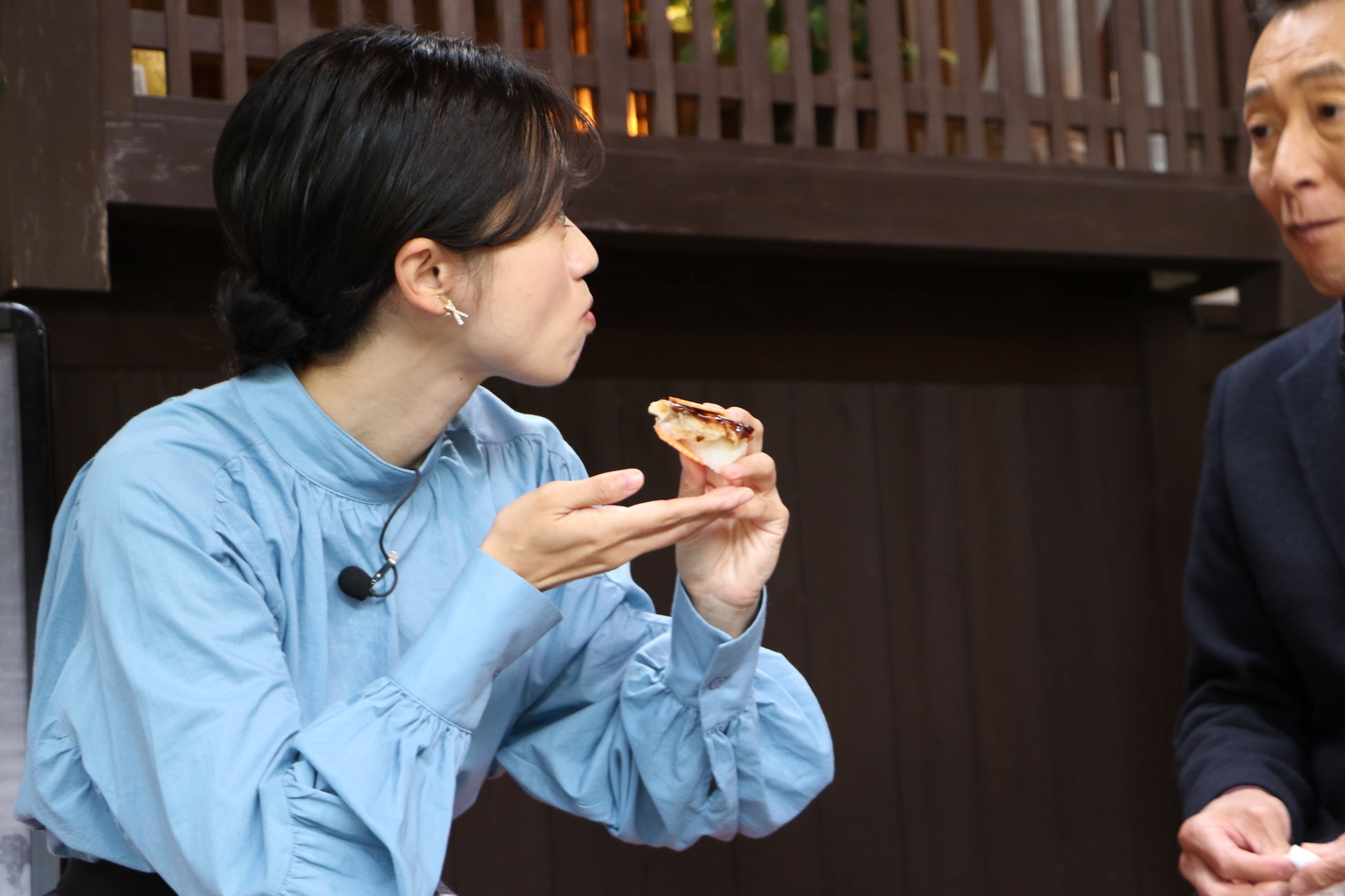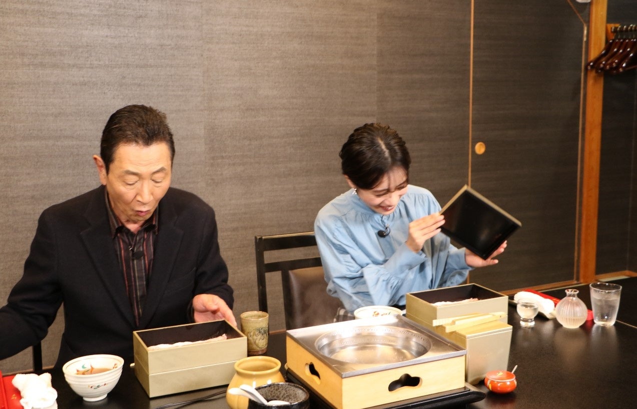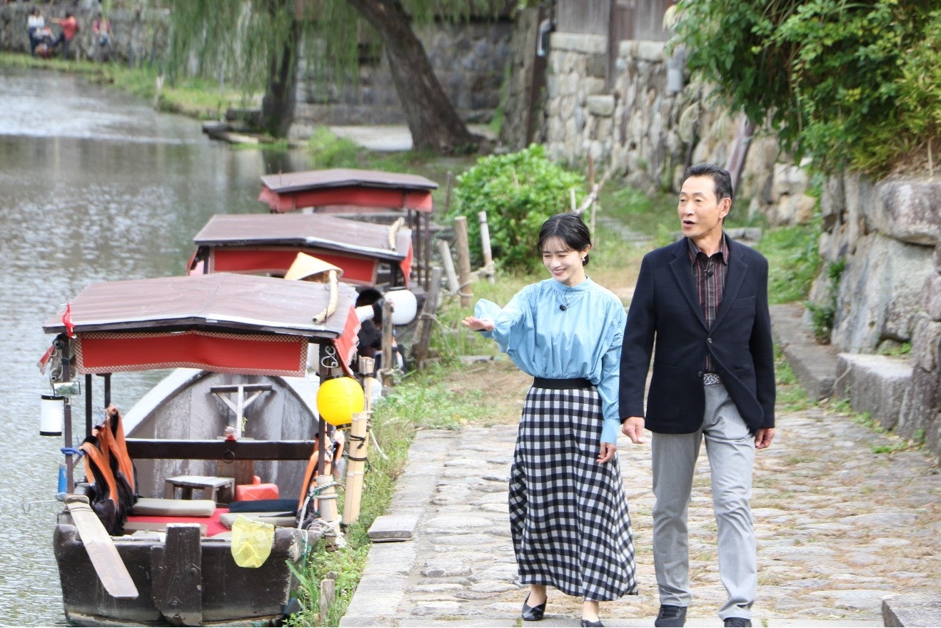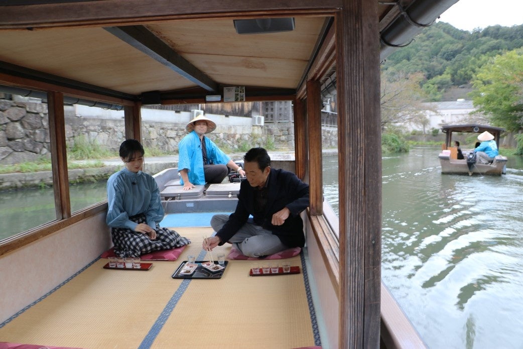 すると三田村のワガママが…。今回特別にお酒を持って舟に乗せていただけることに。八幡堀めぐりに出発です。いい風を浴びながら、舟からの景色も堪能し、『鮒ずし』までいただき、大満足の2人。いい気分になった三田村が歌いだす!