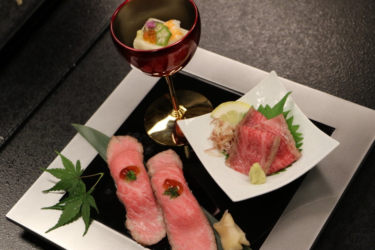 今回の夕食をいただくために近江牛と滋賀名物が味わえる【こまきち】へ。『近江牛の握り』や『近江牛の刺身』を満喫。