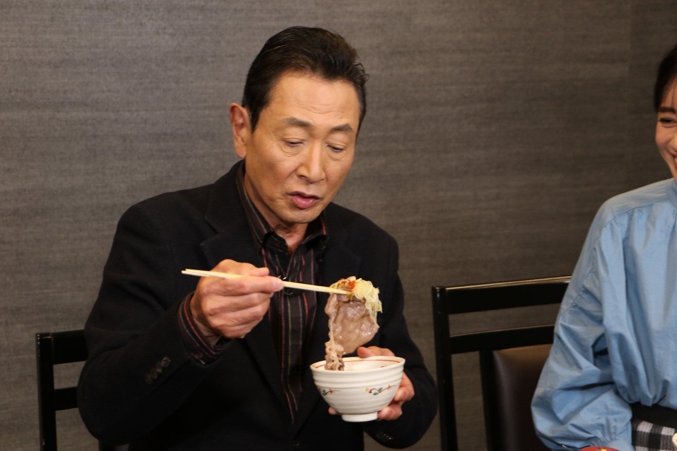 大量のカツオで出汁をとった5段仕込みのつゆと、たっぷりの白ネギを合わせていただきます。美味しさの余り、声もうわずる三田村!