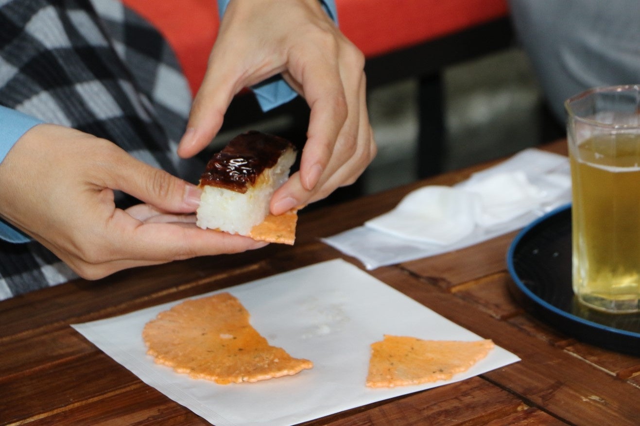 ということで店内へ。なんとも斬新な食べ歩きメニュー『焼さばせん』と『さばの海苔巻』をいただくことに。焼きさばのタレとえびせんの相性抜群です!