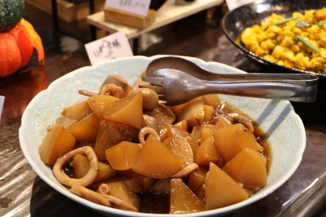 街に戻った2人が、お惣菜メニューに惹かれて入ったのは、フランス料理を修業したシェフが作るオシャレなおばんざいがたくさん並んだ【三松】。