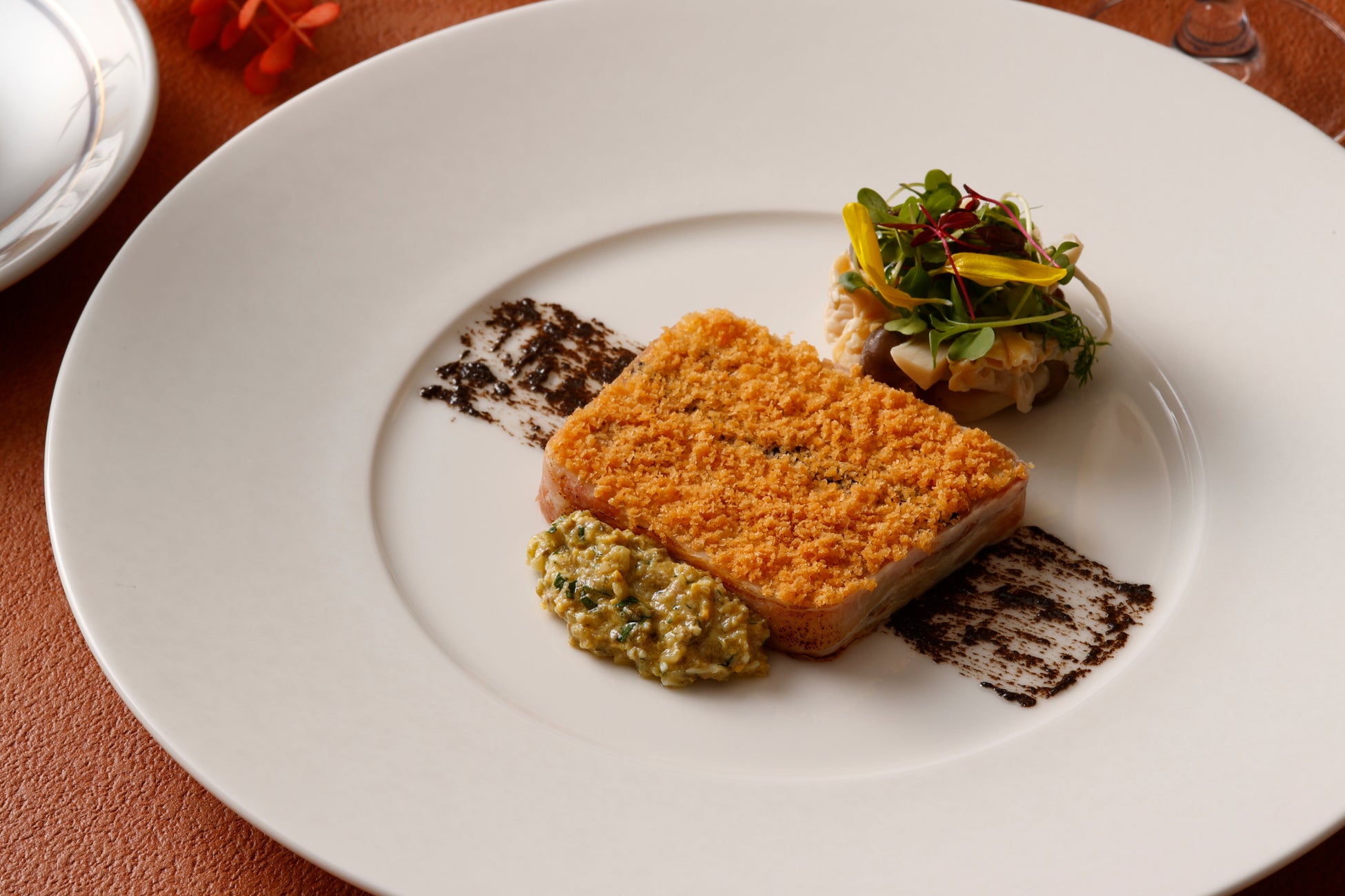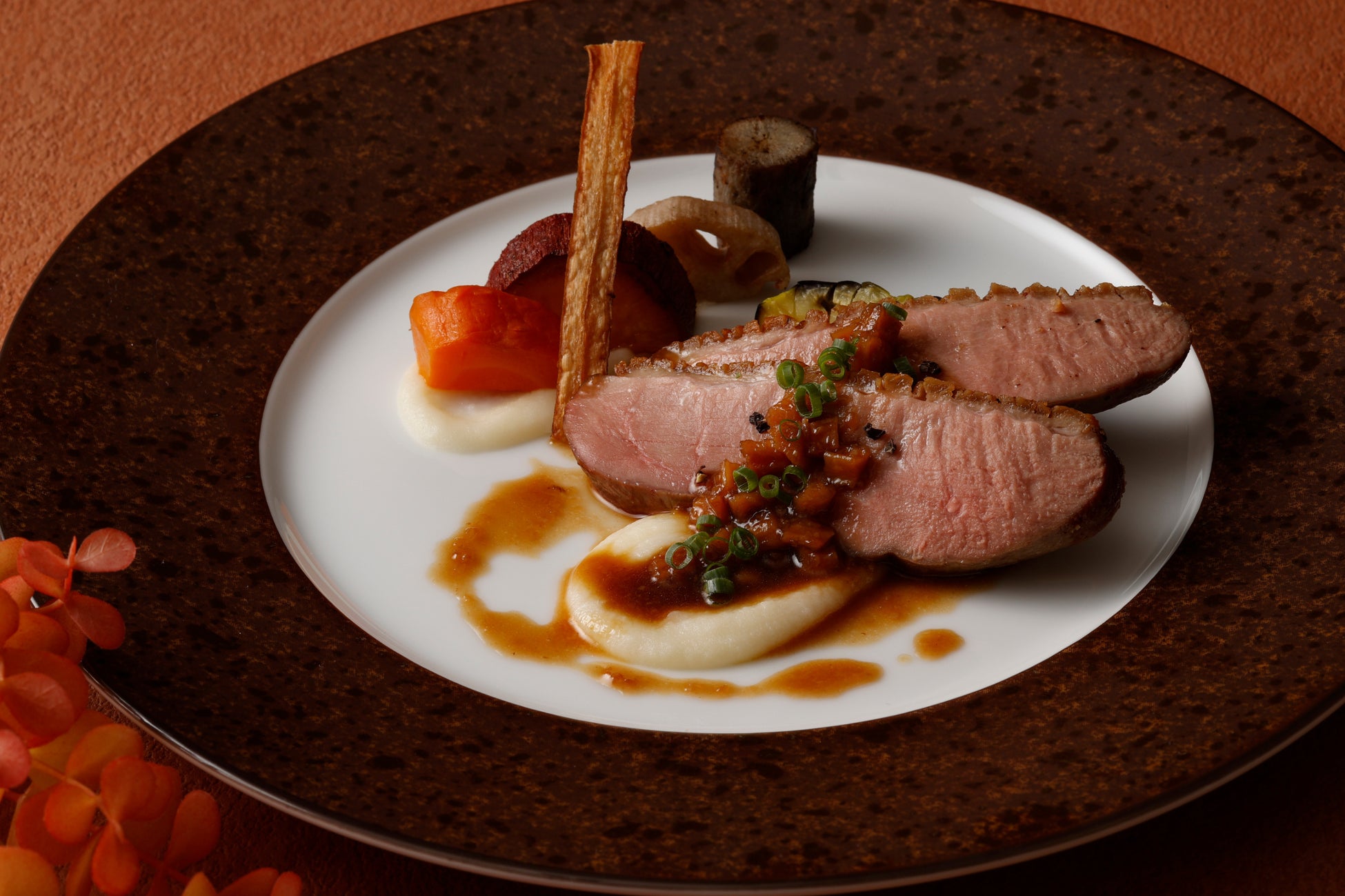 森の落ち葉を絨毯のように見立てた「イワシと男爵イモのテリーヌと茸のマリネ添え」や、豊かな香りが口の中でふんわりと広がる「マッシュルームのポタージュ カプチーノ風」、メイン料理には、コク深い味わいが魅力の牛蒡のソースで仕上げた「鴨胸肉のロースト 牛蒡ソース ナス添え」をご用意しました。デザートには、さつまいも「とみつ金時」をムースに仕上げた、さつまいもの甘味が実りの秋の余韻をもたらす一皿をお楽しみください。