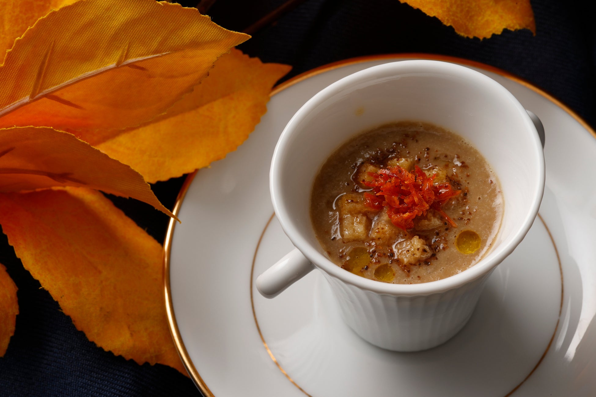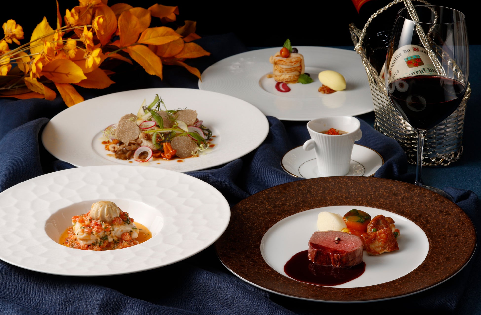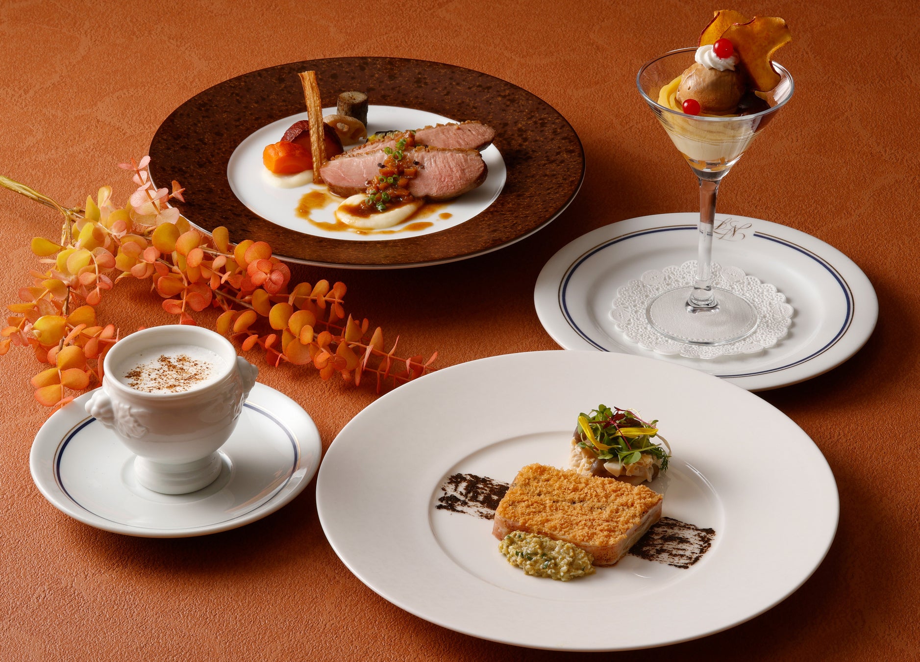 秋の始まりを告げる一口として「セップ茸のヴルーテ チョリソ風味」を、褐色のおち葉が重なり合う様子を表現した「カイユとキノコのサラダ仕立て 秋トリュフを添えて」や紅葉を散りばめたかのような彩りが美しい「白身魚のポワレ デュグレレ風」、森の恵みであるジビエ料理「蝦夷鹿ロース肉のココット焼き ソースポワヴラード」など、美食の秋にふさわしいメニューの数々をご堪能いただけます。