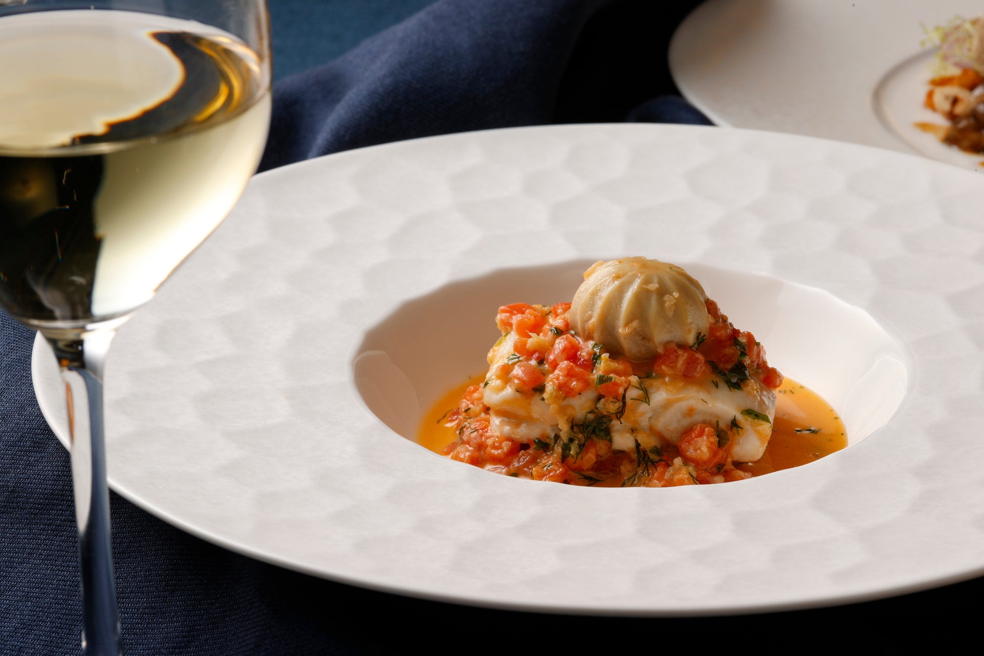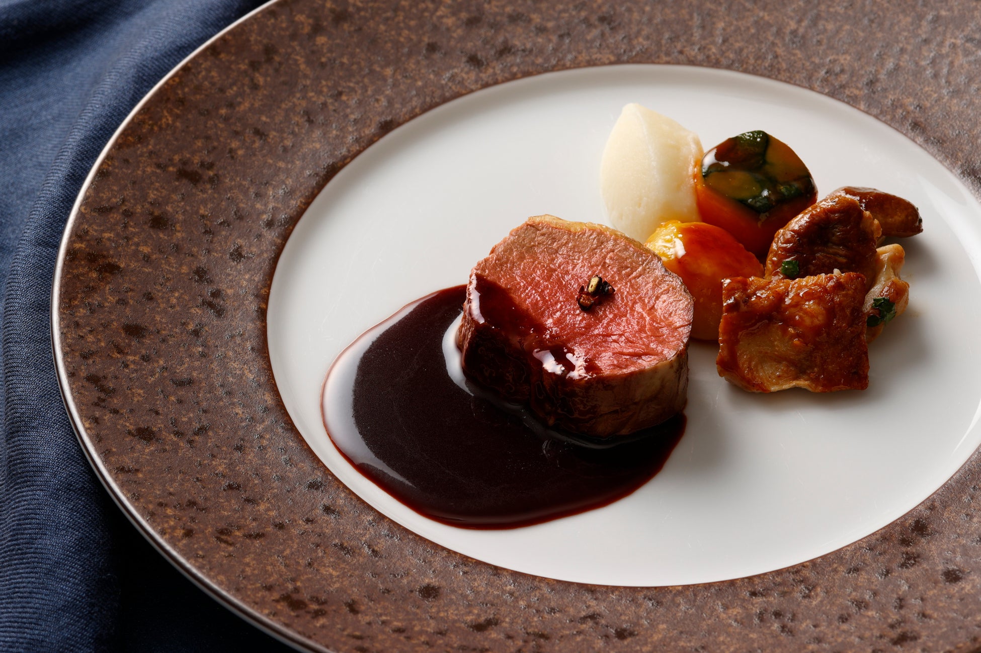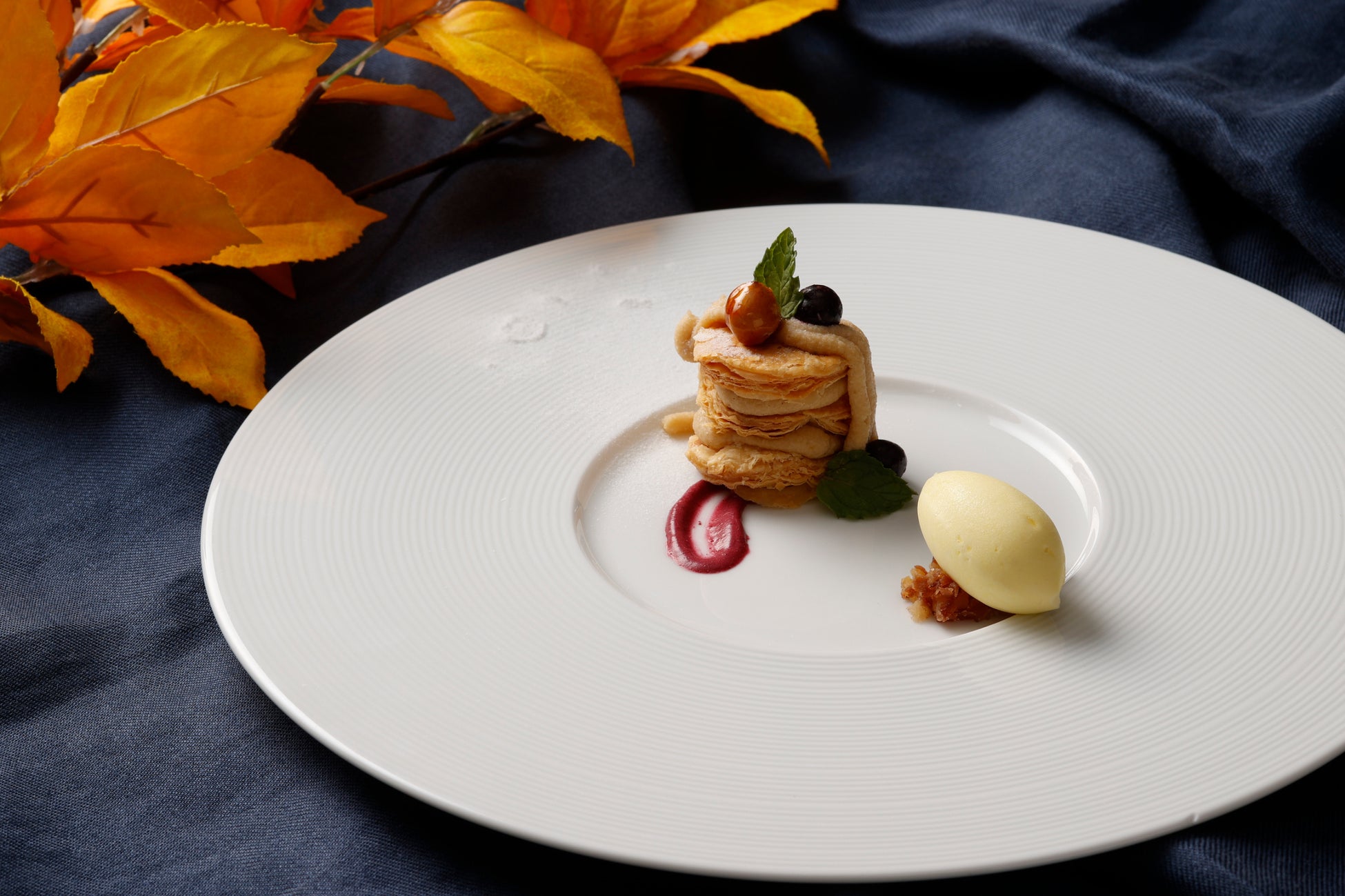 秋の始まりを告げる一口として「セップ茸のヴルーテ チョリソ風味」を、褐色のおち葉が重なり合う様子を表現した「カイユとキノコのサラダ仕立て 秋トリュフを添えて」や紅葉を散りばめたかのような彩りが美しい「白身魚のポワレ デュグレレ風」、森の恵みであるジビエ料理「蝦夷鹿ロース肉のココット焼き ソースポワヴラード」など、美食の秋にふさわしいメニューの数々をご堪能いただけます。