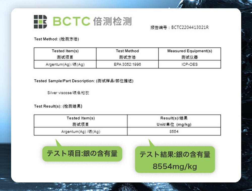 「AgGrip」背面の素材は、検査機関によるテストを通過しており、8554mg/kg 高濃度のシルバーが含まれています。