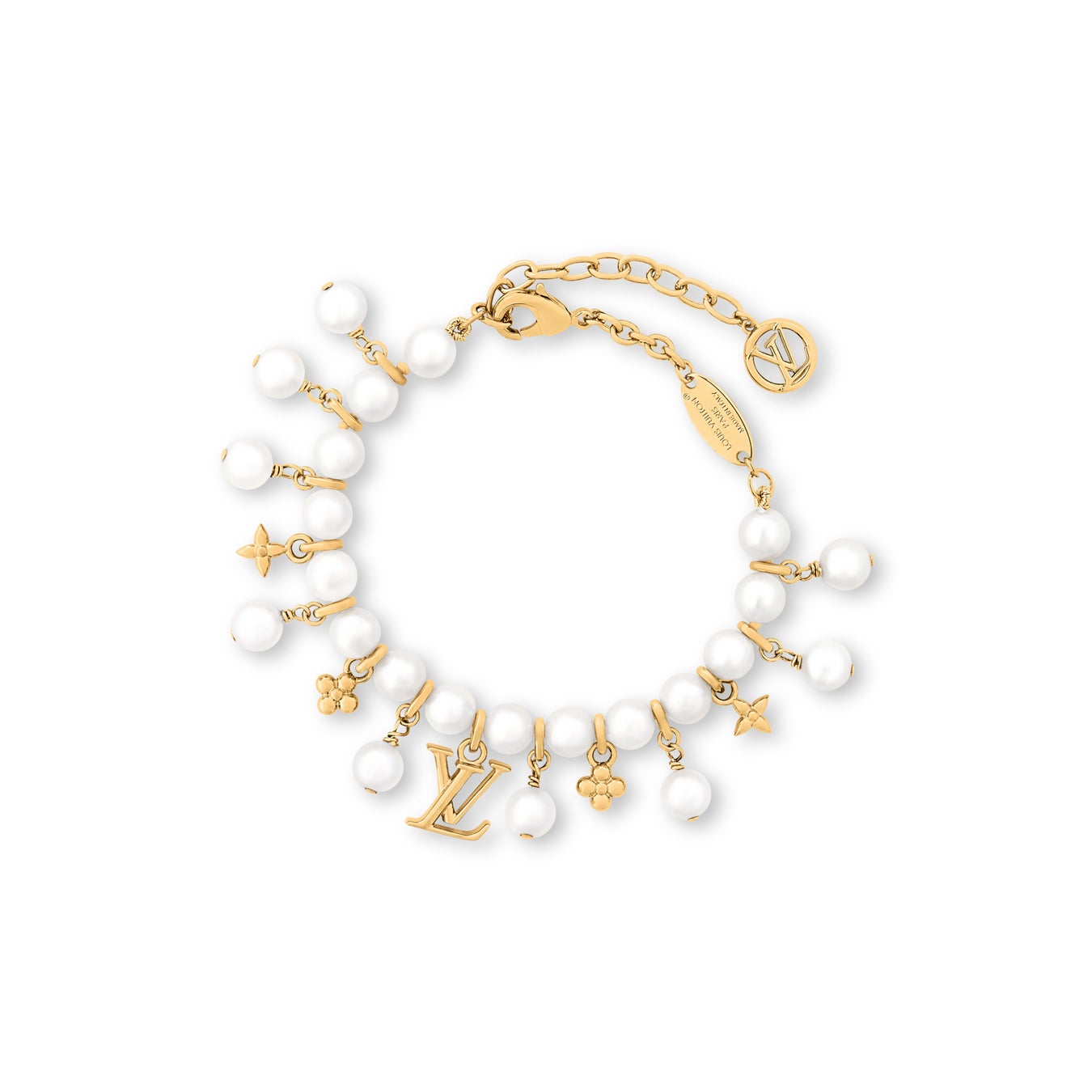 細部まで精緻なデザインの「ブレスレット·パール リバー」。モノグラム·フラワーをさりげなくあしらったホワイトレジンパールと、きらめくゴールドカラーのメタルで象ったモノグラム·フラワーのチャームが交互に施され、手首で優美に揺れ動きます。毎日の装いに上品なシグネチャーアクセントを加えるのに最適なアイテム。