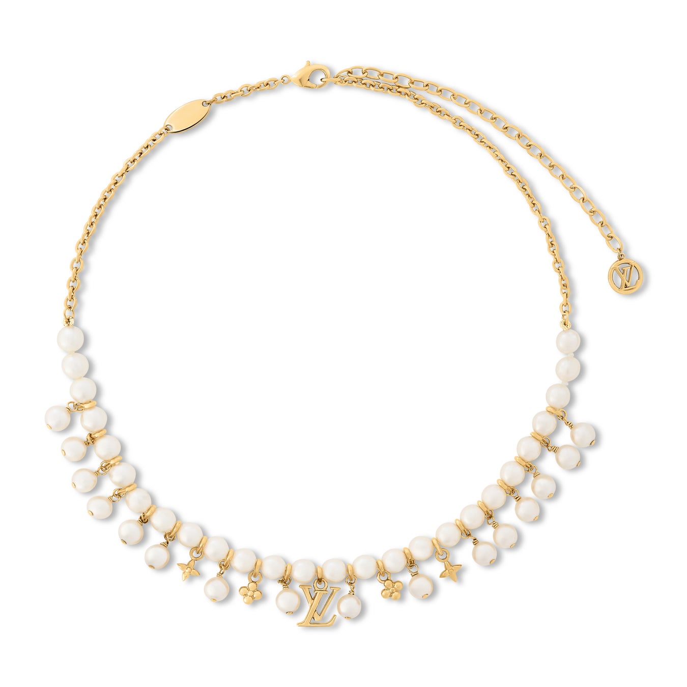 贅沢な素材を使用して精緻なデザインを表現した「ネックレス·パール リバー」。ゴールドカラーのメタルで仕上げた上質なリンクチェーンに、繊細なモノグラム·フラワーをあしらったホワイトのレジンパールが連なり、メゾンを象徴するモノグラム·モチーフのチャームが散りばめられています。毎日の装いにさりげなく洗練された印象を添えるのに最適なアイテム。