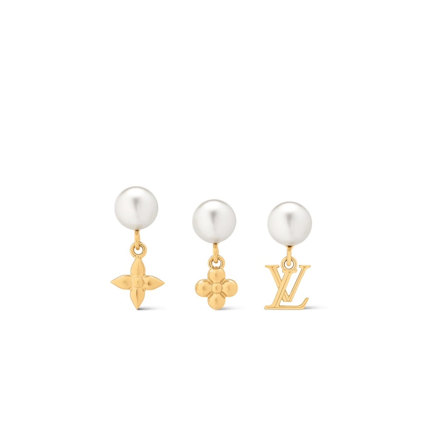 独創性が際立つセットの「ピアス·パール リバー」。3つのジュエリーそれぞれに、モノグラム·フラワーが繊細にあしらわれた光沢感のあるホワイトレジンパールと、きらめくゴールドカラーのメタルで精緻に象ったモノグラムのチャームを添えました。アイキャッチーなピアスは単体でも、合わせて着けても控えめなシグネチャーのステートメントを放ちます。
