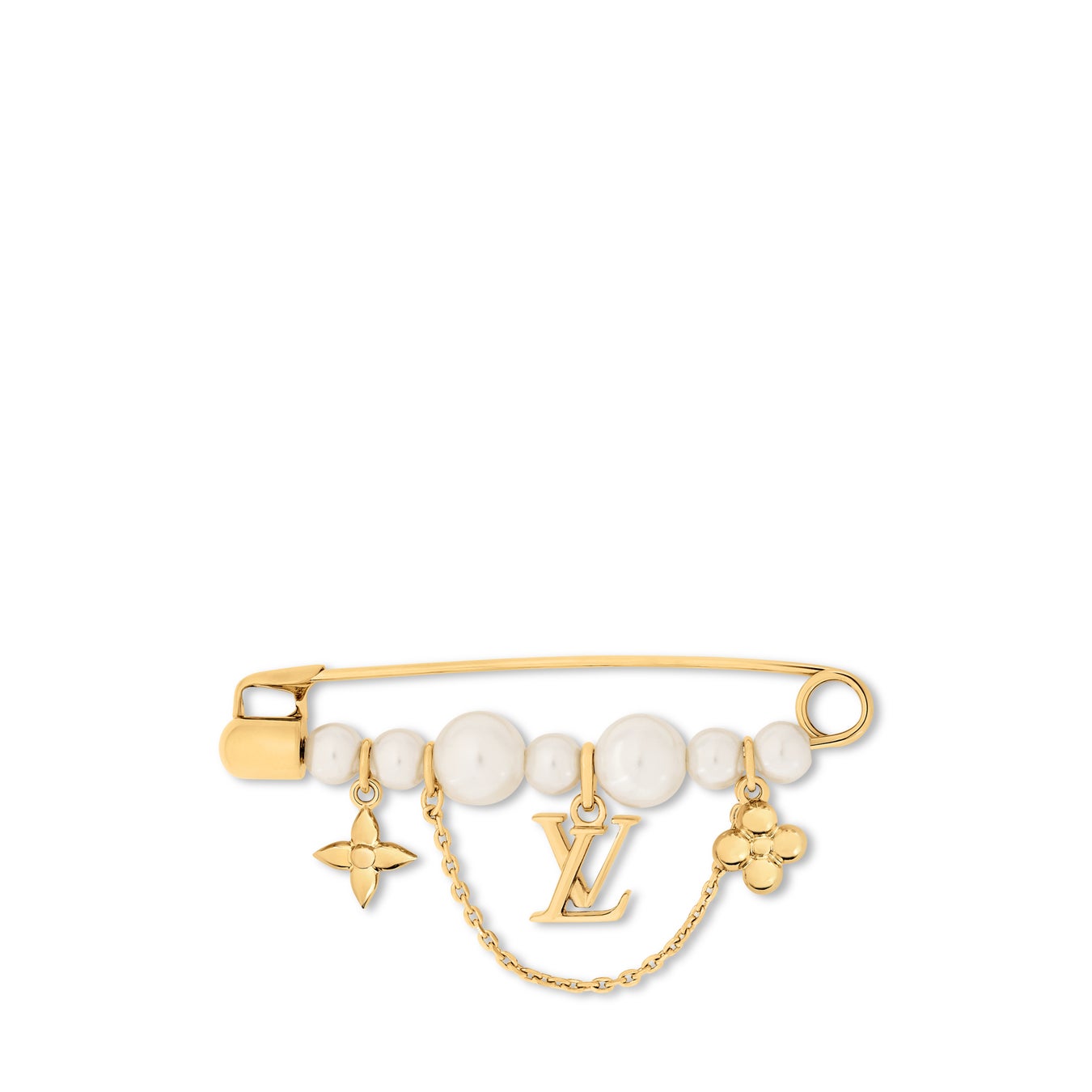 「ブローチ·パール リバー」は、モノグラム·フラワーをあしらった光沢感のあるホワイトレジンパールの連なりと、きらめくゴールドカラーのメタルで象ったLV イニシャルと2つのモノグラム·フラワーで細部にまでこだわったデザインです。繊細なチェーンがこの贅沢でエレガントなアクセサリーに洗練された華やかさを添えます。