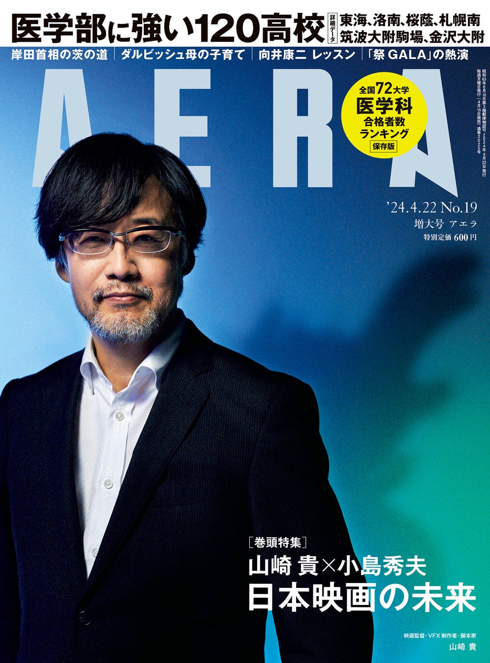4月15日発売のAERA4月22日増大号は、「ゴジラ-1.0」で第96回アカデミー賞視覚効果部門を受賞した映画監督の山崎貴さんが表紙に登場。その山崎さんと「メタルギア」シリーズの生みの親で希代のゲームクリエイターの小島秀夫さんが、日本映画の未来や日本発のコンテンツが世界と対峙するために何が必要か、などについてじっくりと語り合いました。掲載が続く「大学合格ランキングシリーズ」の第7弾は、「医学部に強い高校」です。国公立50大学医学科への合格者数が多いトップ120高校をランキングで紹介するほか、全国72大学医学科の合格者数高校ランキングもあります。メジャーリーグを代表する投手となったダルビッシュ有選手の母が子育てを巡る赤裸々な思いを語ったインタビューも掲載。自民党の裏金問題を受け、岸田首相と解散の行方について分析した政治ジャーナリストの記事も。大好評連載「松下洸平 じゅうにんといろ」は、料理研究家のコウケンテツさんとの対談全4回のラスト回です。ほかにもさまざまな企画が詰まった一冊です。