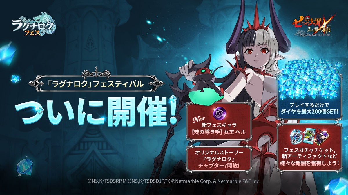『七つの大罪 ~光と闇の交戦~』最大200ダイヤを獲得できる!初のオリジナルシリーズ『ラグナロク』フェス開催!新SSRキャラ【魂の導き手】女王 ヘルが登場