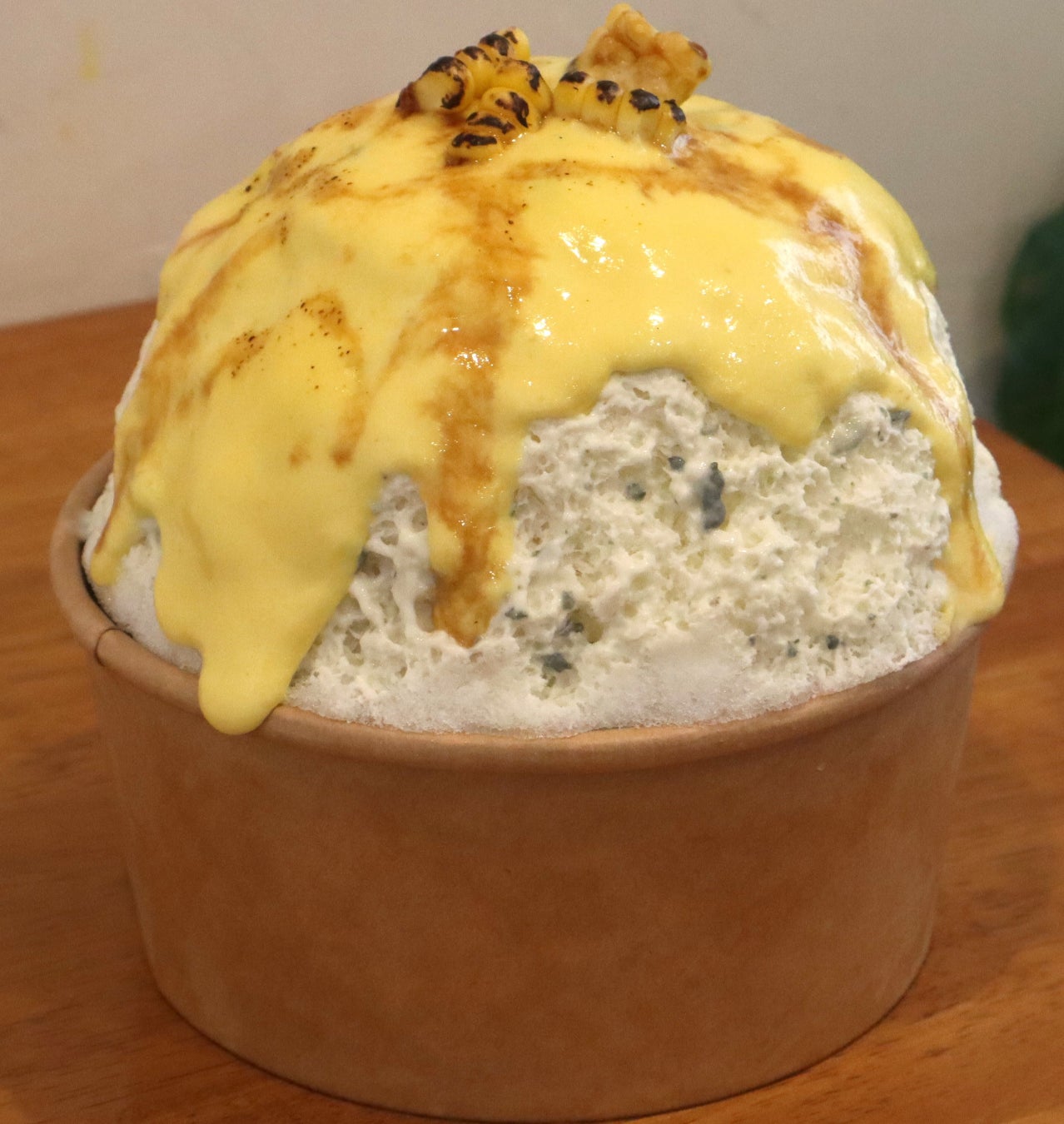 白みそシロップに、みたらしソースときな粉を合わせた一品。ふわふわの氷と相性抜群です!