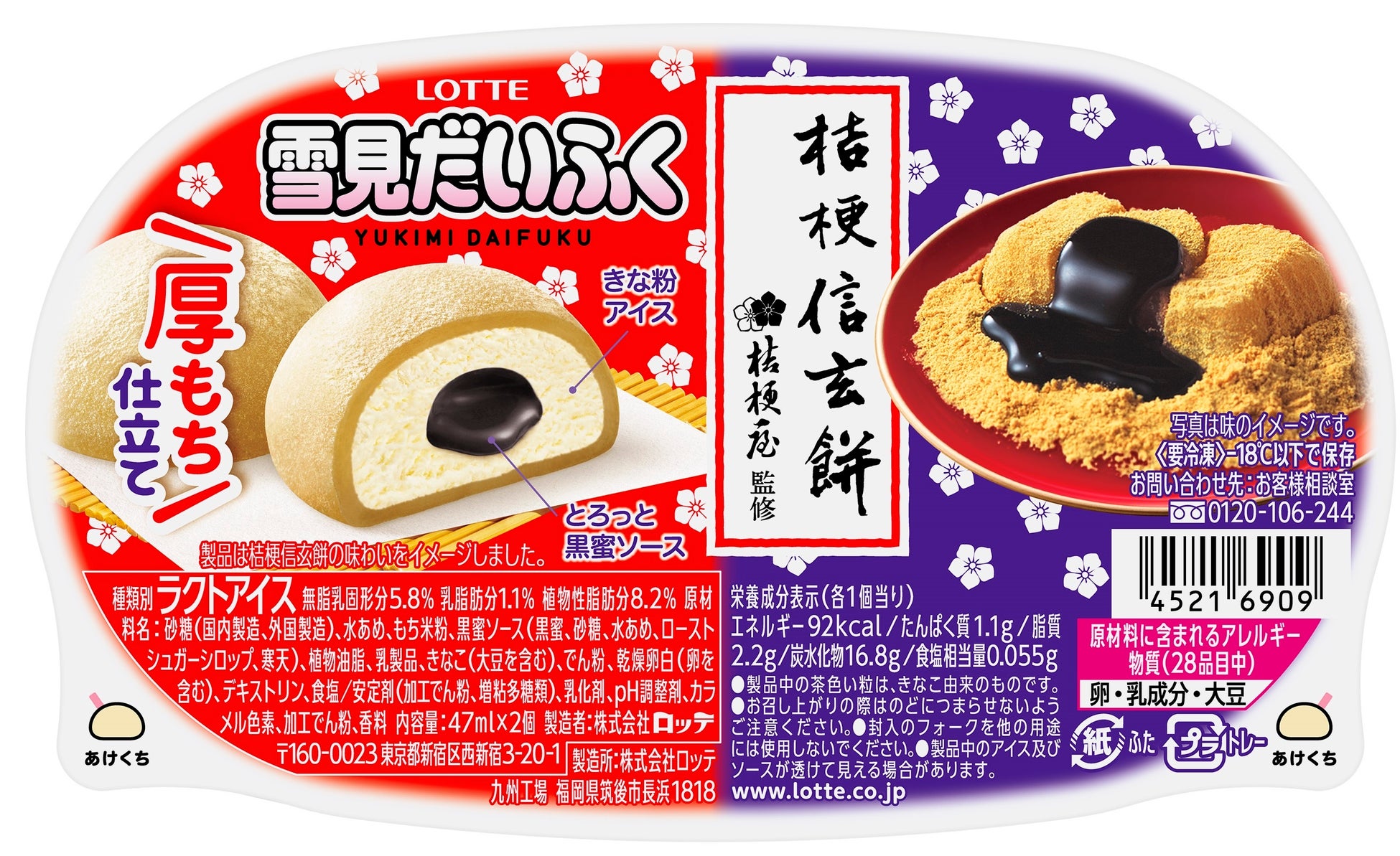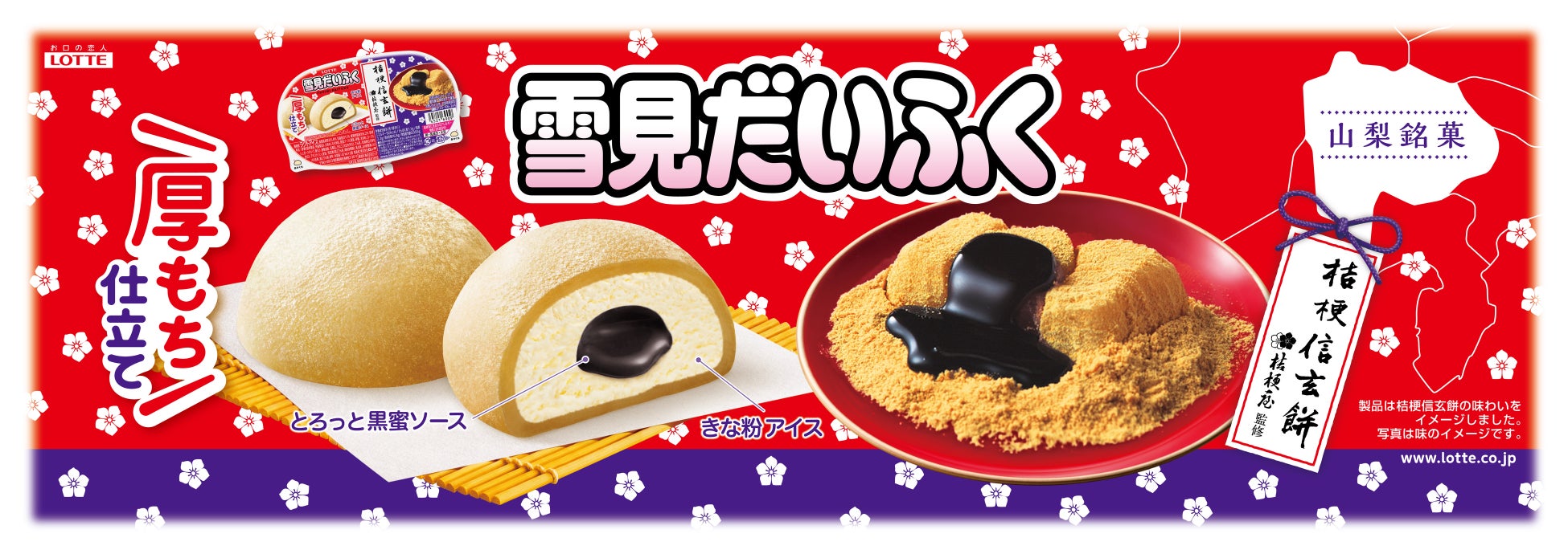 株式会社ロッテは、「雪見だいふく」ブランドから、明治22年創業の株式会社桔梗屋が製造・販売する山梨銘菓「桔梗信玄餅」とコラボレーションした「桔梗屋監修 雪見だいふく×桔梗信玄餅 」を1月17日(火)より全国のコンビニエンスストアで先行発売いたします。