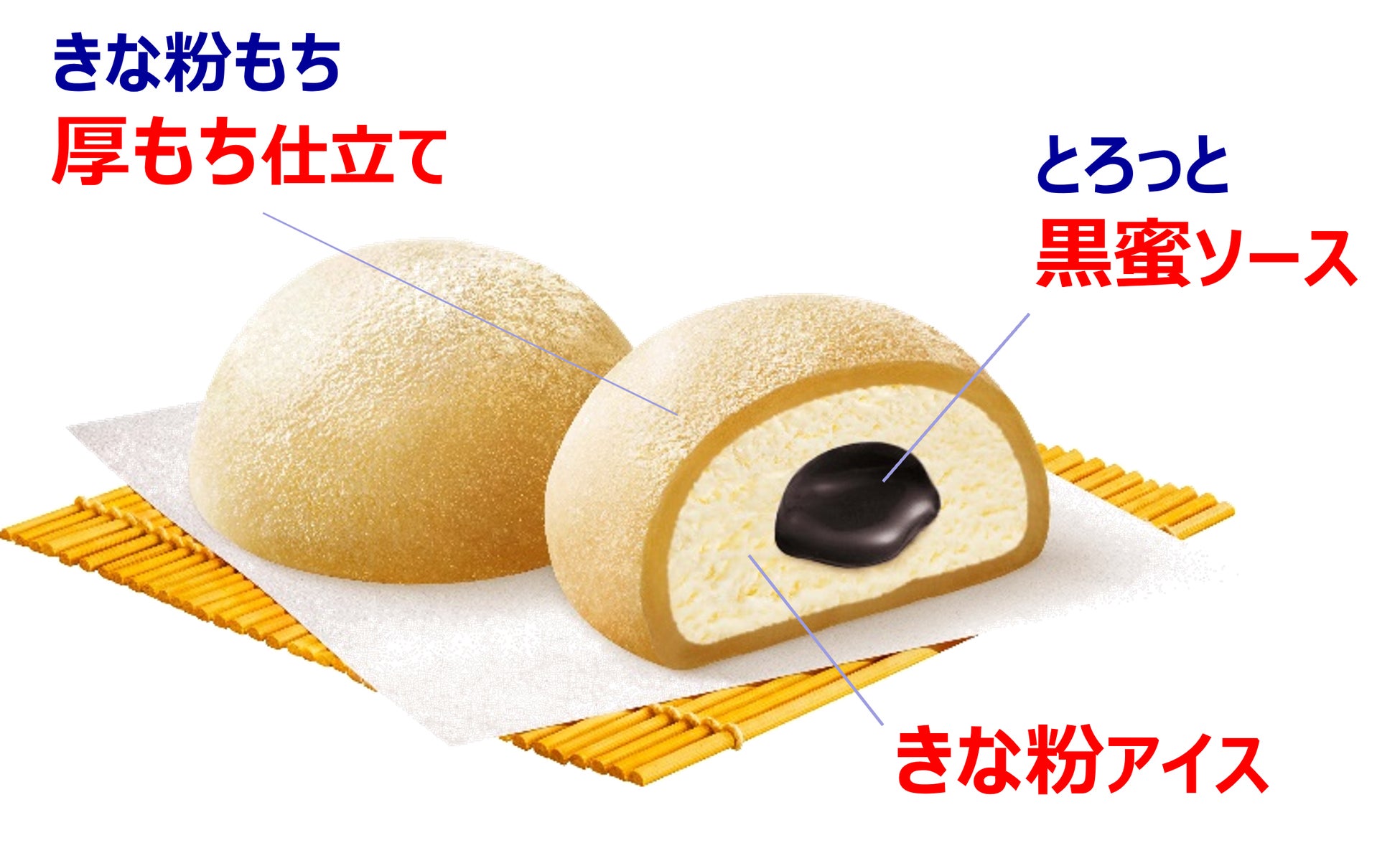 - 「桔梗信玄餅」の味わいをイメージし、とろっとした黒蜜ソースを、きな粉アイスと冷凍下でもやわらかい“厚もち”仕立てのきな粉もちで包んだ特別な「雪見だいふく」に仕上げました。