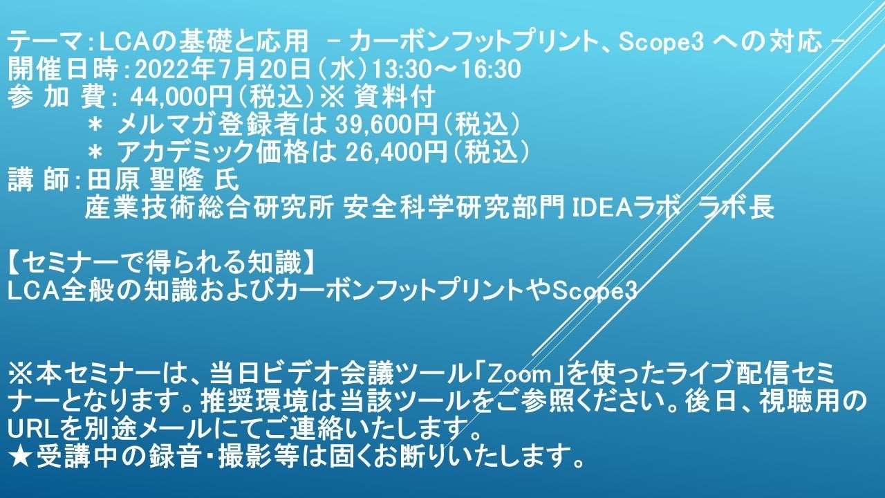 先端技術情報や市場情報を提供している(株)シーエムシー・リサーチ(千代田区神田錦町: https://cmcre.com/ )では、 各種材料・化学品などの市場動向・技術動向のセミナーや書籍発行を行っておりますが、 このたび「LCAの基礎と応用 - カーボンフットプリント、Scope3 への対応 –」と題するセミナーを、 講師に田原 聖隆 氏 産業技術総合研究所 安全科学研究部門 IDEAラボ ラボ長)をお迎えし、2022年7月20日(水)13:30より、 ZOOMを利用したライブ配信で開催いたします。 受講料は、 一般:44,000円(税込)、 弊社メルマガ会員:39,600円(税込)、 アカデミック価格は26,400円(税込)となっております(資料付)。