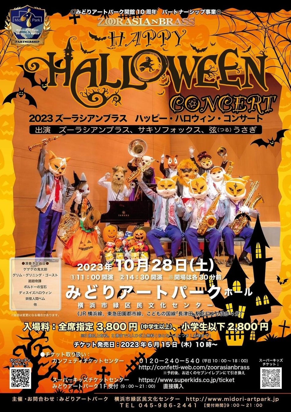 みどりアートパークでは、開館10周年記念公演として「2023 ズーラシアンブラス ハッピー・ハロウィン・コンサート」を10月28日(土)に開催(午前/午後 2回公演)します。