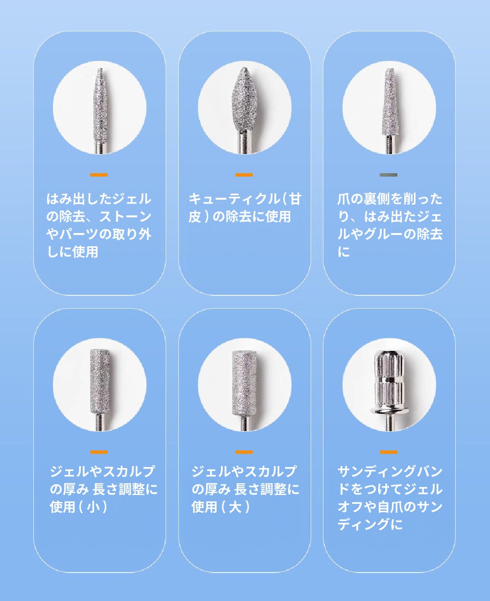 NailDazzleには使いやすい6種類のビットが付属しています。