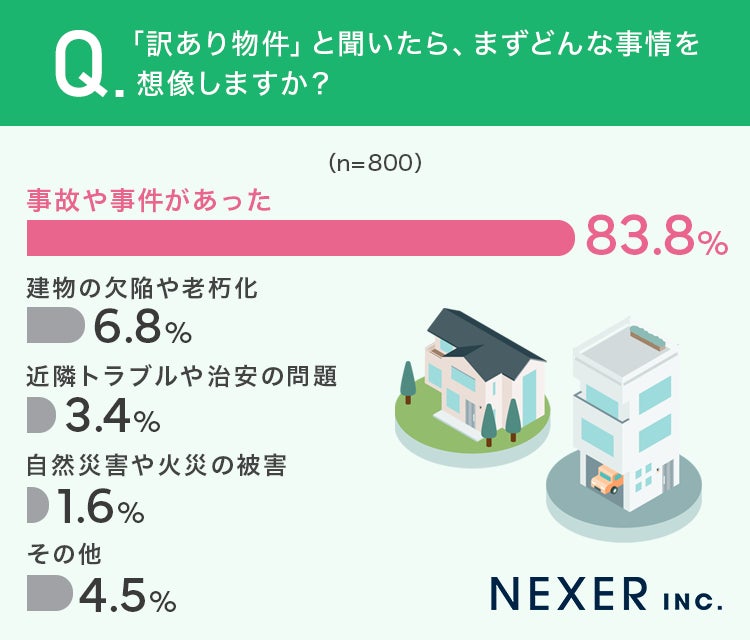 「訳あり物件」と聞いて真っ先に想像されるのは、事故や事件があったという事情で、その割合は圧倒的な83.8%に上ります。