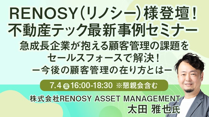 【トランスコスモス】【RENOSY(リノシー)様登壇! 不動産テック 最新事例セミナー】急成長企業が抱える顧客管理の課題をセールスフォースで解決!を7/4(金)に開催