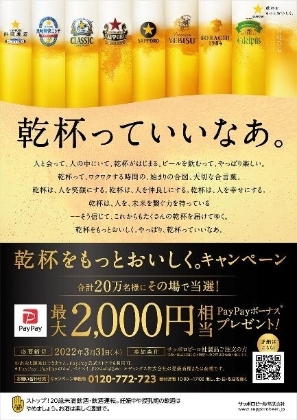 サッポロホールディングス(株)のグループ企業であるサッポロビール(株)は、新型コロナウイルスの感染拡大の影響により甚大な影響を受けた外食市場を応援したいという想いから「乾杯をもっとおいしく。キャンペーン」を本年の春夏施策として継続的に実施します。