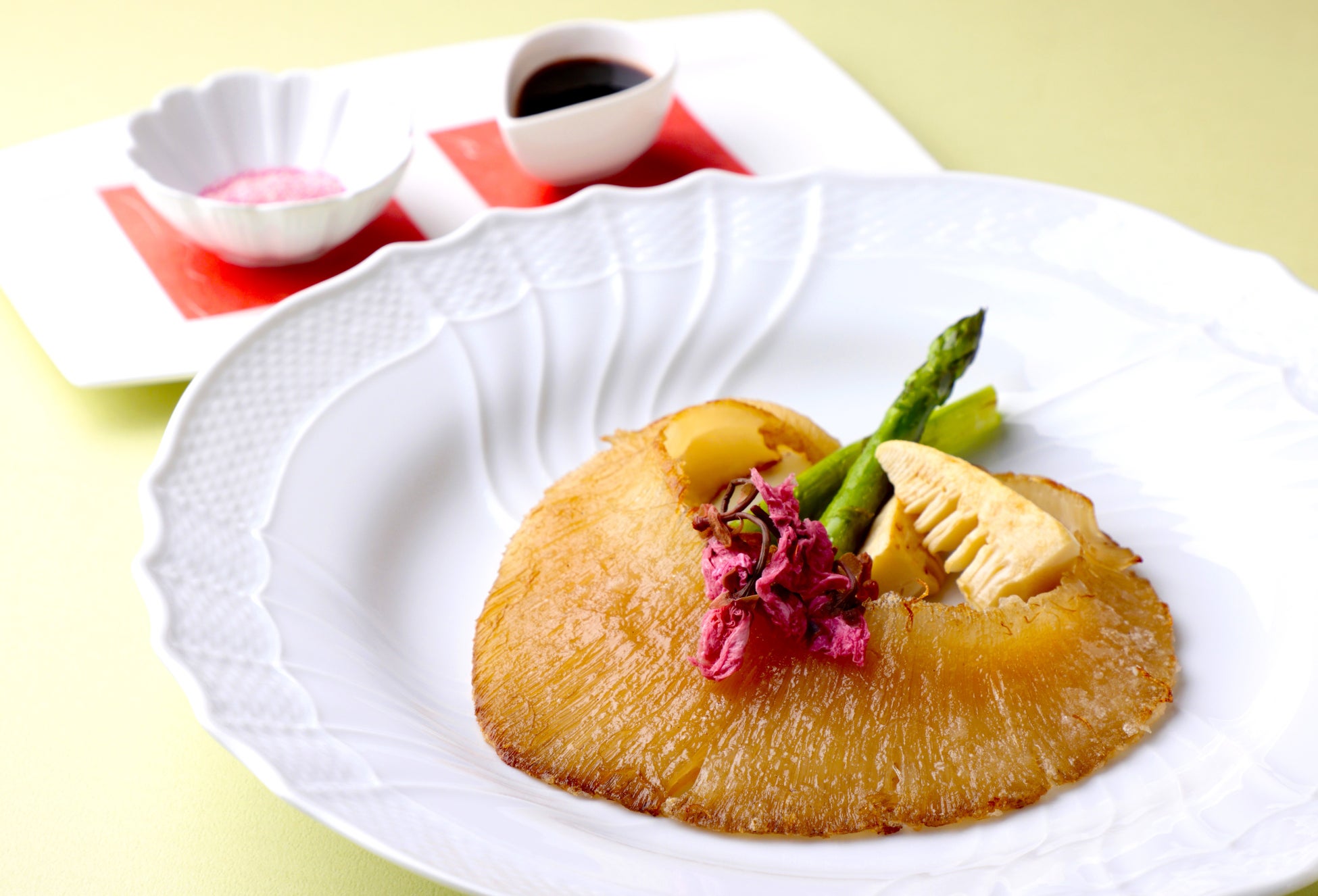 また、「中国料理 皇家龍鳳」では、吉切鮫を使用した「フカヒレステーキ」をご提供します。さっぱりとした味わいのスープで下味を付けたフカヒレの形を崩さぬよう丁寧に焼き上げ、外はパリッと中はしっとりと柔らかい食感をご堪能いただけます。八角や生姜などの香辛料を加えじっくりと煮詰めた特製ソースと、ほのかに桜香る岩塩をお好みで付けてお楽しみいただけ、より一層フカヒレの香ばしさと味わい深さを際立てます。付け合わせには、あたたかな春を感じさせる“桜の塩漬け”や、成長が早くまっすぐと伸びることで縁起のよいといわれる“筍”、春に旬を迎える“アスパラガス”を使用し、お子様やお孫様の健やかな成長を祝うシーンにもおすすめのひと品です。