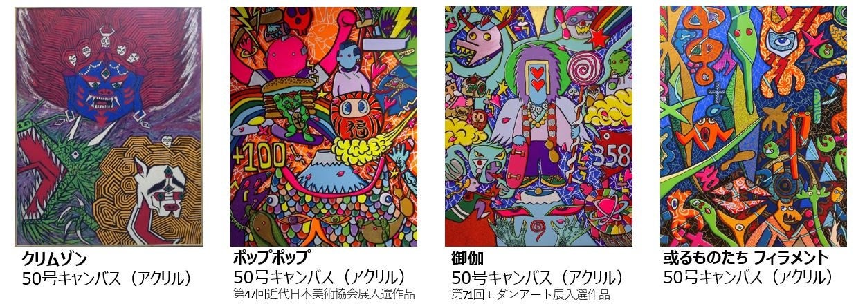 このほかアクリルキャンパス画や黒板チョークアートも展示します。さらに、ほぼ毎日、本人が在廊し、黒板チョークアートやかまぼこ板を公開制作していく予定です。会期中には、先輩芸人でアートの世界でも才能を開花させているとろサーモン・久保田が会場に駆けつけ、ピストジャムとその個展を応援する予定です。