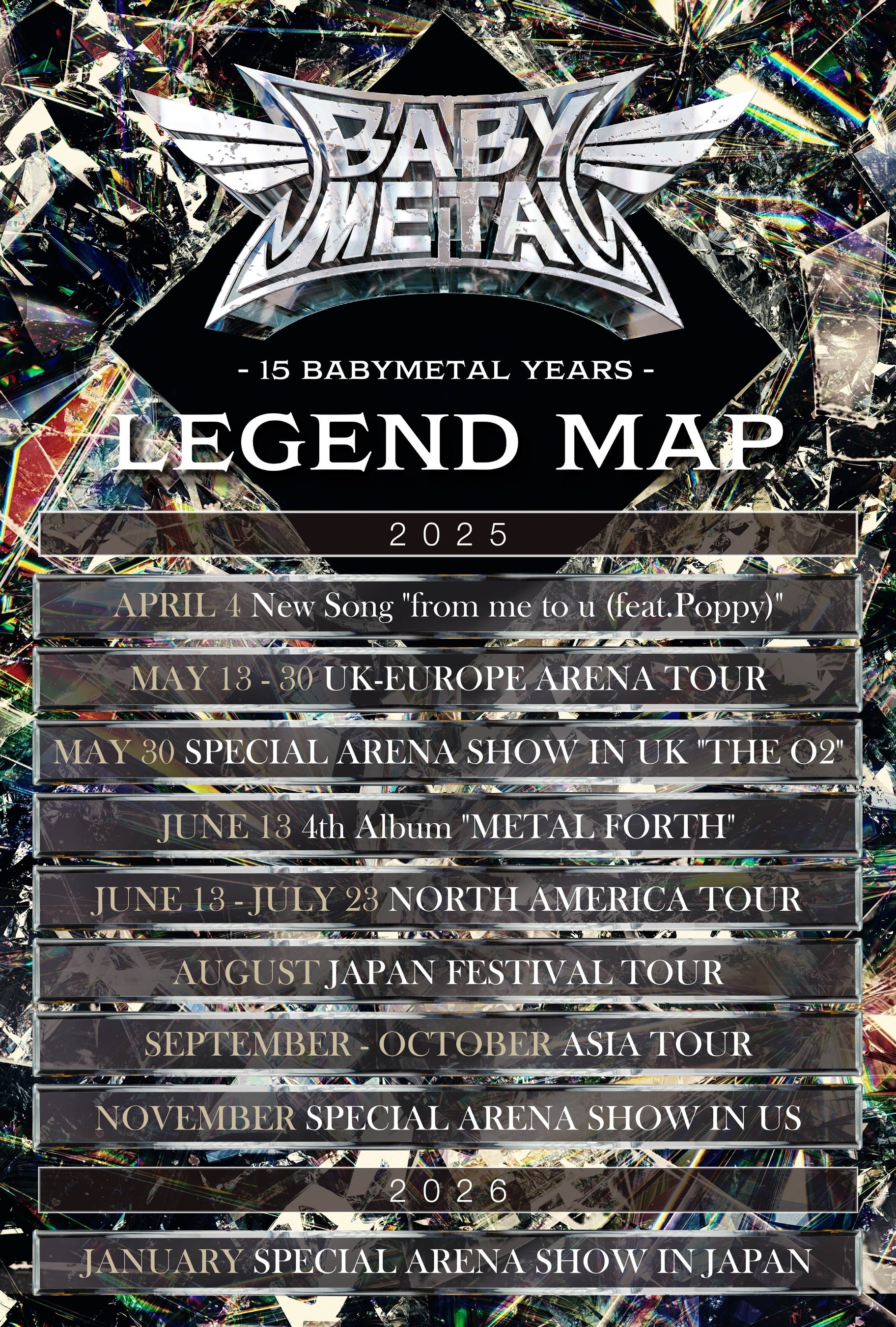 2010年結成。2023年4月よりSU-METAL、MOAMETAL、MOMOMETALからなる新生BABYMETALとして新章がスタート。2024年4月以降、初の南米ツアーを含めたワールドツアーを敢行。世界22カ国、国内外通算51公演を行い、スペシャルゲスト出演の公演を除いた総動員数は、約101万人に上る驚異的な記録を打ち立てた。2025年は結成15周年を迎え、1月から自身初となるレギュラーラジオ番組「BABYMETALのメタラジ!」の放送が開始となり、メタルな友達=通称『メタトモ』をゲストに迎えて『メタトモ』の輪を広げる活動が始動。2月と3月にオーストラリアのメルボルン、ブリスベン、シドニーで開催される「KNOTFEST AUSTRALIA」への出演、5月からは自身初となるUK& ヨーロッパでのアリーナツアー(全8カ国12公演)、5月30日にはUKで行われるツアーファイナルとして、日本人グループとしては初となる、ロンドンのTHE O2アリーナ(会場収容人数:約20,000人)で単独公演を開催する。そして6月13日には4枚目のオリジナルアルバム「METAL FORTH」を、新たにグローバルレーベルパートナーと迎えたキャピトル・レコードからリリースし、同日のヒューストン公演を皮切りに過去最大規模の北米ツアーをスタートさせる。さらには、日本やアジアでのツアーを経て、11月にはアメリカ、2026年1月には日本でのスペシャルアリーナショーを開催することが決定している。
