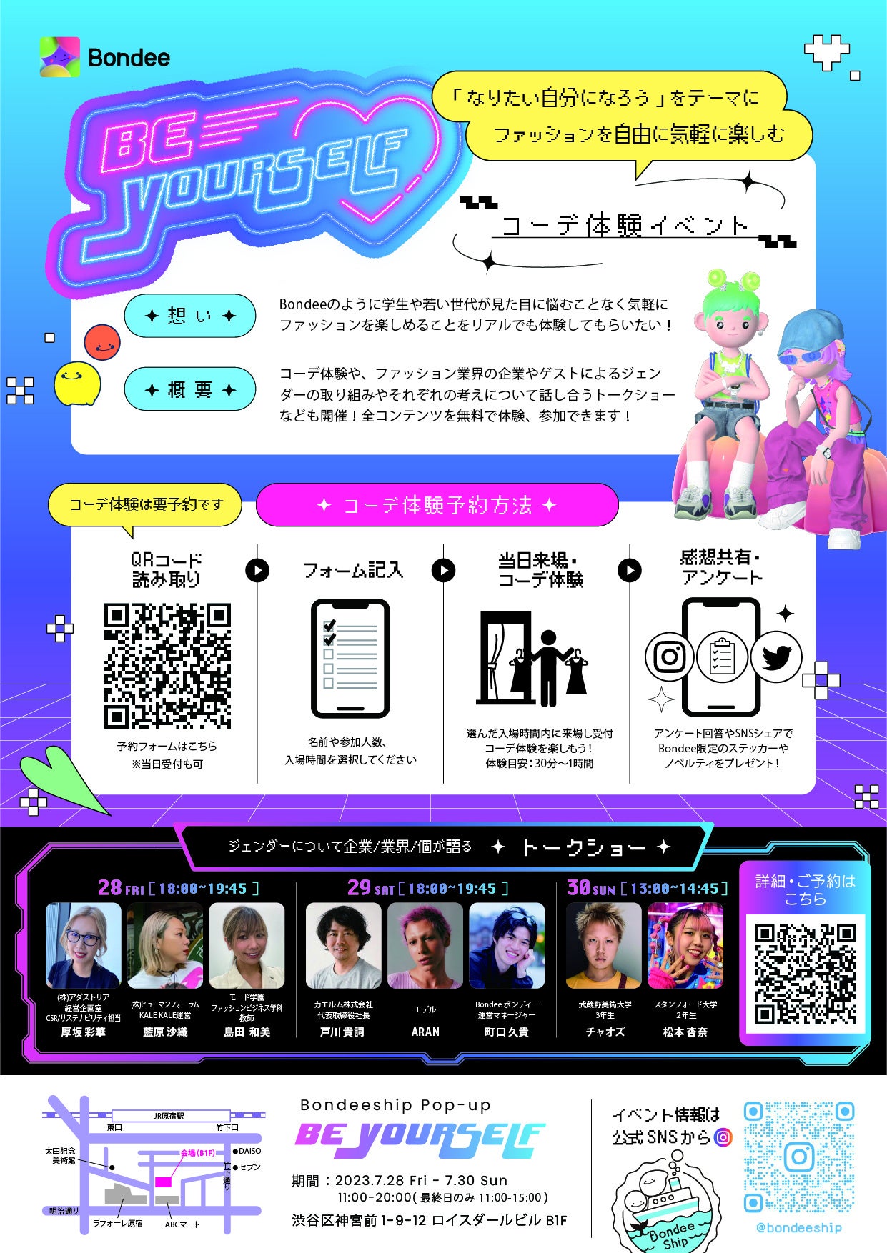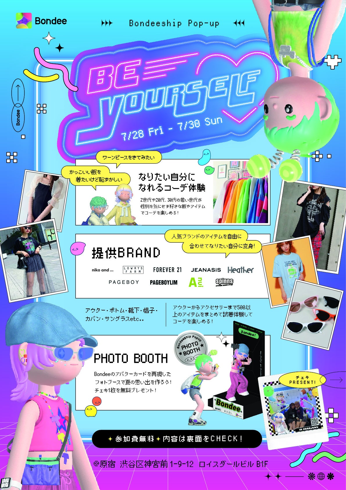 Bondeeの世界から飛び出してきたかのような様さまな洋服の中から皆さんの「なりたい自分」を見つけてください!また、自由なファッションを楽しめる企画としてランダムに選ばれるアイテムでコーディネートにチャレンジするイベントも開催予定です。