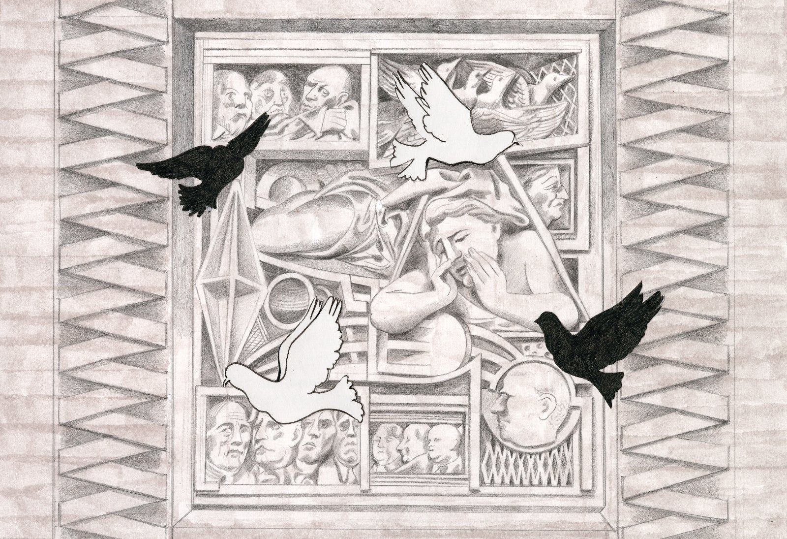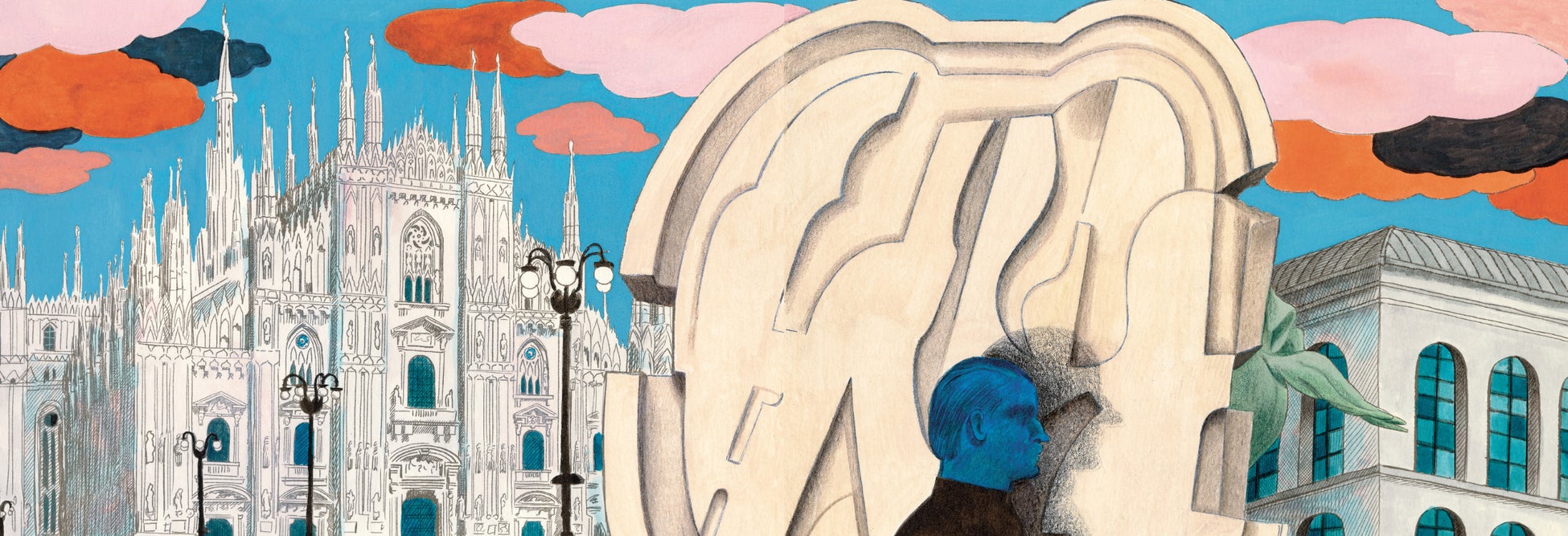 1978年パリ生まれのこのフランス人アーティストは、常にユニークかつ寛大な眼差しで世界を眺めてきました。アーティスト一家(母は教師兼画家、父はデザイナー兼彫刻家)で育った彼女は、パリのデュペレ応用美術学校でビジュアルコミュニケーションを学んだ後、将来夫となるジェイミー·ロックレイジ(Jamie Rocklage)と共に2003年にニューヨークへ移住しました。そこで「ファッション·フォトグラフィーの教祖的存在」であるスティーヴン·マイゼルとの人生を変える出逢いを経験。雑誌『Vogue』での2人の初となるコラボレーションはこの若い女性のキャリアにとって跳躍台の役目を果たし、主要な国際的出版物(『Vogue』、『The New Yorker』、『Vanity Fair』)で多数の特集が組まれました。2014年にフランスに戻った後、夫妻と娘(ほどなく息子も家族に加わる)はブリュッセルへ移り、2018年以来、アトミウム·エリアで暮らしています。メディア、出版、ファッションの世界でそれぞれに創造的エネルギーを発揮して足跡を残し、プラダのランウェイ(2014年春夏コレクション)でも、ジョーン·バエズの半生を描いた政治的なグラフィック·ノベル(Actes Sud Juenesse刊、2024年9月)のイラストでも同じように才能を発揮しています。「トラベルブック」の目的地を決める段になり、彼女にとってイタリアは自然な選択に思えました。それは、自分のルーツへの回帰(彼女の曽祖父母はトリノの北にあるフィオラーノ·カナヴェーゼの出身)であり、新しい風であり、「日常からの解放」、そして自らを刷新しうる、自分だけの時間と空間をなすものでした。彼女はミラノに魅了されました。それまではただ通り過ぎるだけだった都市が、今や、ファッションやデザイン、金融、アートの活気溢れる中心地であることが彼女にとって明らかになりました。彼女は単身あるいは姉妹や友人と連れ立って、合計5回、ミラノを訪れました。ミラノの雰囲気やパラッツォのコンクリートに当たる光に魅せられて以来、彼女はミラノの輝きを存分に浴び、隠れた奥深さを明らかにすると共に、絵葉書的なイメージよりも、街を活気付けているあらゆるディテールに意識を集中させました。彼女のスケッチブックは、解読の手掛かりとなるような無数のディテールを明らかにします。タペストリーのモチーフや看板のタイポグラフィー、そして、ドゥオーモ広場までずっと感じられる、ノヴェンチェント美術館(近代美術館)にあるマリノ·マリーニが彫刻した胸像群の消え去りがたい存在感を認識するのは読者にとっての喜びです。このアーティストは、ミラノでの体験を触れることのできるものにすべく努めました。彼女は、「自分の直感を貫く」ために、新しい技法を探り、雑然としていながらも楽しげに並び合うフォルムとスタイルで遊ぶことを自分に許しました。「ミラノは、中庭に面した格子や扉を、幾重にも重ね合わせたように感じられます」とデタランテは言います。「絶えずフレームが切り替わり、そのたびに謎が深まります。何が隠されているかをいつも知りたくなる」。それゆえ彼女は、作品に切り絵を含めて、それぞれのドローイングを別の現実で「補強」することにしました。彼女は、ジョルジョ·デ・キリコの形而上学の教えも、空間を照らすジョルジョ·モランディの光も、さらにはジオ·ポンティやエットレ·ソットサスといったデザインの巨匠たちの大胆さも決して忘れていません。同じ目的で、彼女は、フェルトペンや木炭、鉛筆などの繊細なテクニックを用いて、1980年代のフメット(イタリア漫画)にインスパイアされたコミックストリップのコマをグラフィックテーブルで描く時と同様の器用さで、素材やテクスチャーに命を吹き込みます。彼女の直感的な選択はすべて、単なる理解を超えたイタリアに対する造詣の深さや、予想外でありながら常に洗練されたグラフィックな偶然への情熱、さらには、大衆的なものとラグジュアリーなもの、よい趣味とそうでないものを分かつ境界の空間への情熱が滲み出ており、最終的には、いきいきとした美の形が浮かび上がります。