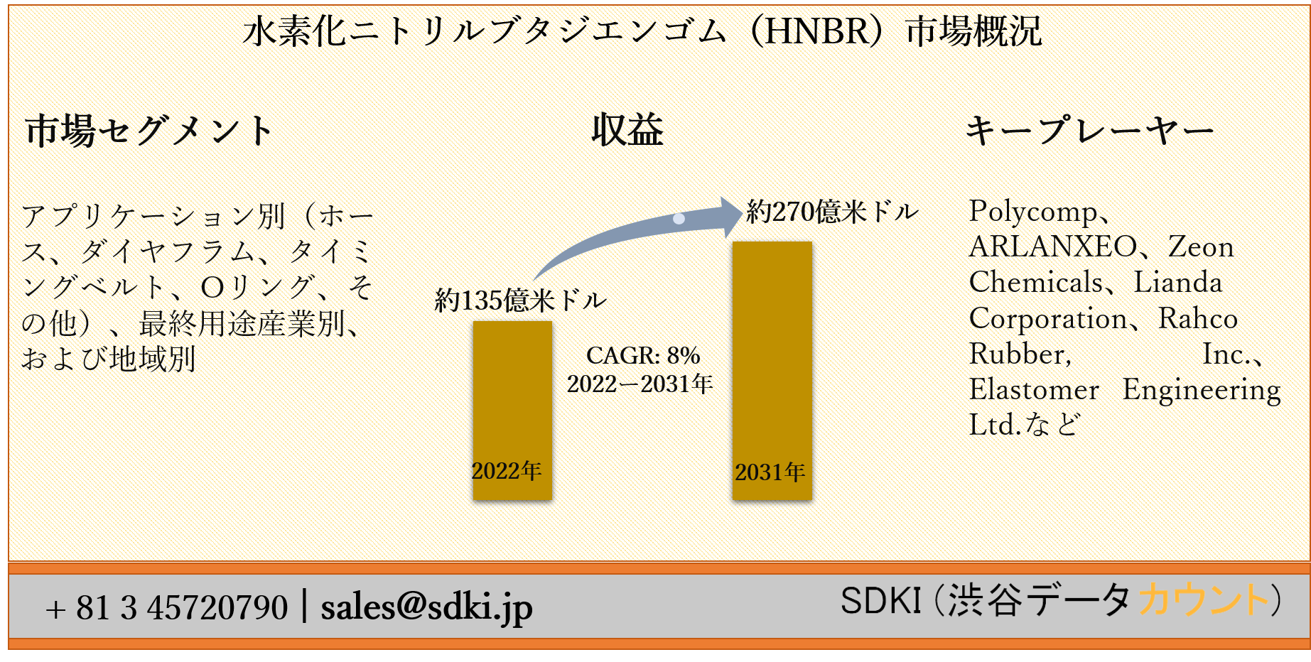 SDKI Inc.は、「水素化ニトリルブタジエンゴム(HNBR)市場ー世界予測2022ー2031年」新レポートを 2022年02月11日に発刊しました。この調査には、水素化ニトリルブタジエンゴム(HNBR)市場の成長に必要な統計的および分析的アプローチが含まれています。レポートで提供される主要な産業の洞察は、市場の既存のシナリオに関する読者に市場の概要についてのより良いアイデアを提供します。さらに、レポートには、市場の成長に関連する現在および将来の市場動向に関する詳細な議論が含まれています。