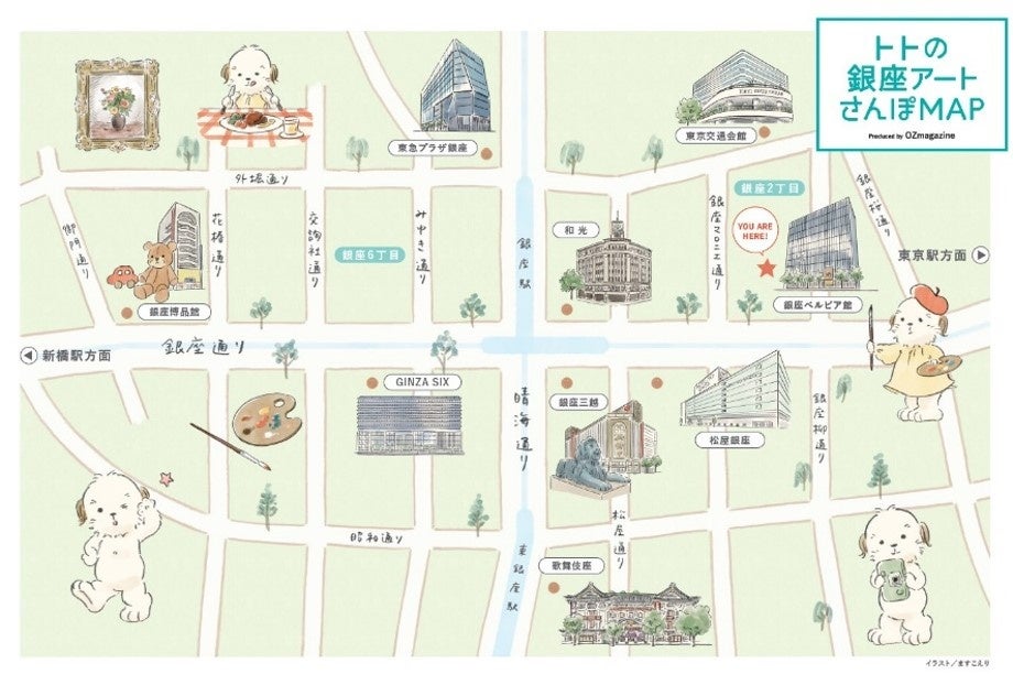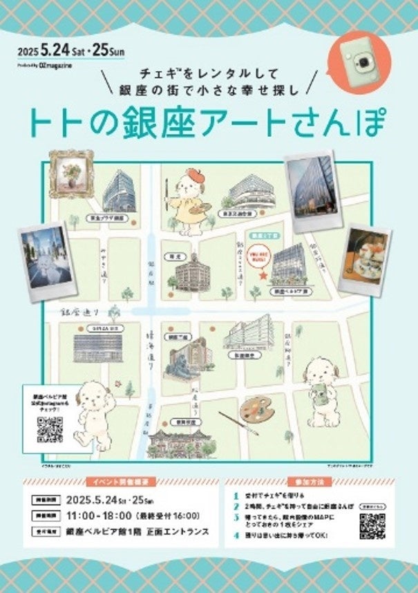 スターツ出版株式会社(東京都中央区、代表取締役社長:菊地修一)は、三井不動産商業マネジメント株式会社(所在地:東京都中央区、代表取締役社長:大林 修)が運営する、銀座ベルビア館とのコラボレーションイベントとして、5月24日(土)~5月25日(日)の2日間限定で「トトの銀座アートさんぽ」を開催いたします。期間中、銀座ベルビア館にてinstax“チェキ”無料貸出しを実施。銀座を散歩しながら心躍る風景を撮影後、館内の大きな銀座MAPにお気に入りの1枚を貼り付けし、みんなの「みつけたアート」が詰まった特別な銀座MAPを完成させます。イベント期間、館内7、8FのダイニングフロアにはOZmagazineのマスコットキャラクター「トト」のフォトブースも登場します。