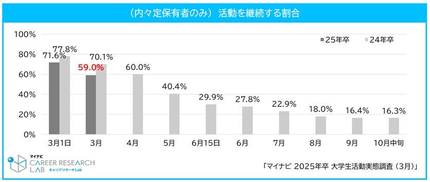2025年卒学生の3月時点での内々定率は47.4%(前年比17.4pt増)で、先月に引き続き、前年を大きく上回って推移している。 また、内々定保有者のうち活動を継続する※1割合は59.0%だった。前年から11.1pt減少しているものの、6割近い学生が活動を継続する意向にあるようだ。【図1、2】