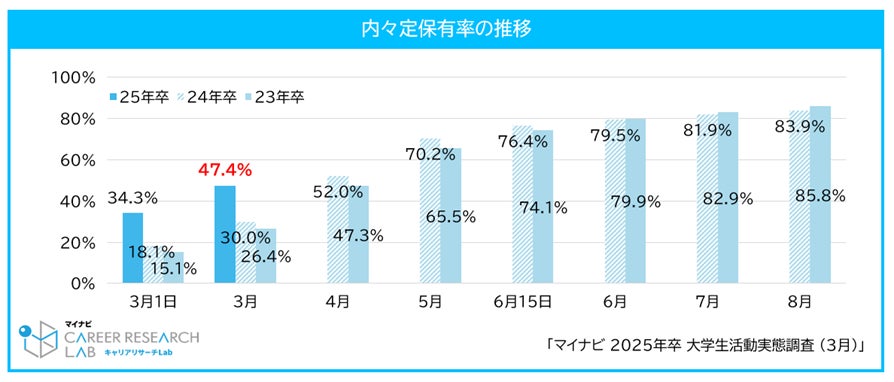 ■2025年卒業予定の大学生・大学院生の内々定率は47.4%(前年比17.4pt増)