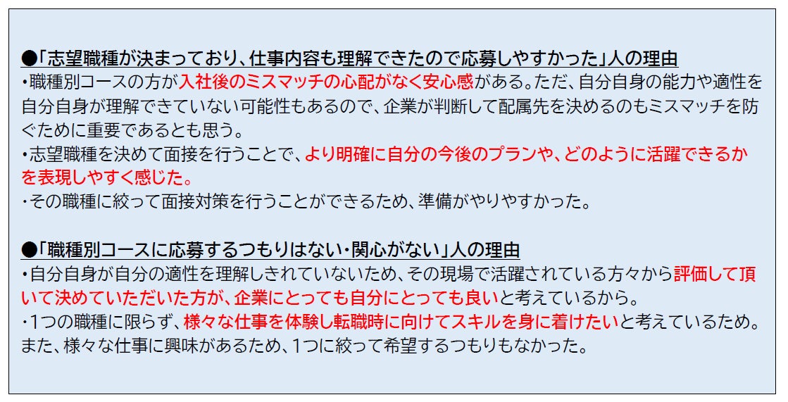 職種別コースについて、「志望職種が決まっており、仕事内容も理解できたので応募しやすかった」人の理由としては、「ミスマッチの心配がなく安心」や「面接時に、より明確に自分の今後のプランを表現しやすい」という声が見られた。仕事軸のマッチング精度が上がることで、より良い選択ができたと感じているようだ。一方で、「職種別コースに応募するつもりはない・関心がない」人の理由としては、「自分の適性を理解しきれていないため、評価して頂いて決めていただいた方がいい」や、「様々な仕事を体験し転職時に向けてスキルを身に着けたい」という声があがった。自身の適性理解を不安視する声もあったが、ジョブローテーションなどを前提に積極的に様々な仕事を体験することを望む声も見られた。【図4】