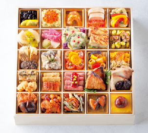 伝統的な和の食材を中心に、洋と中華のメニューも贅沢に取り入れました。ハレの食卓にふさわしいお重です。