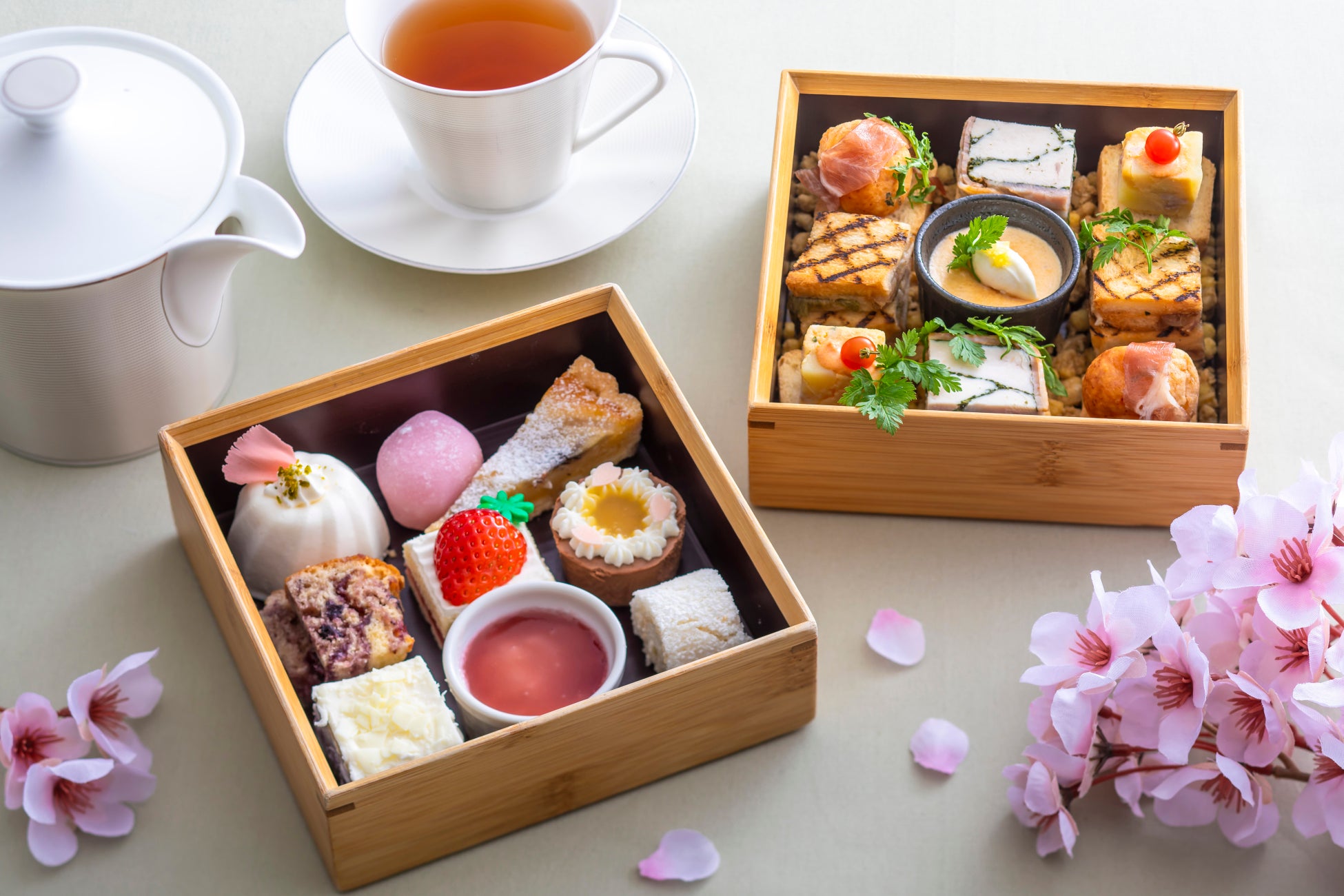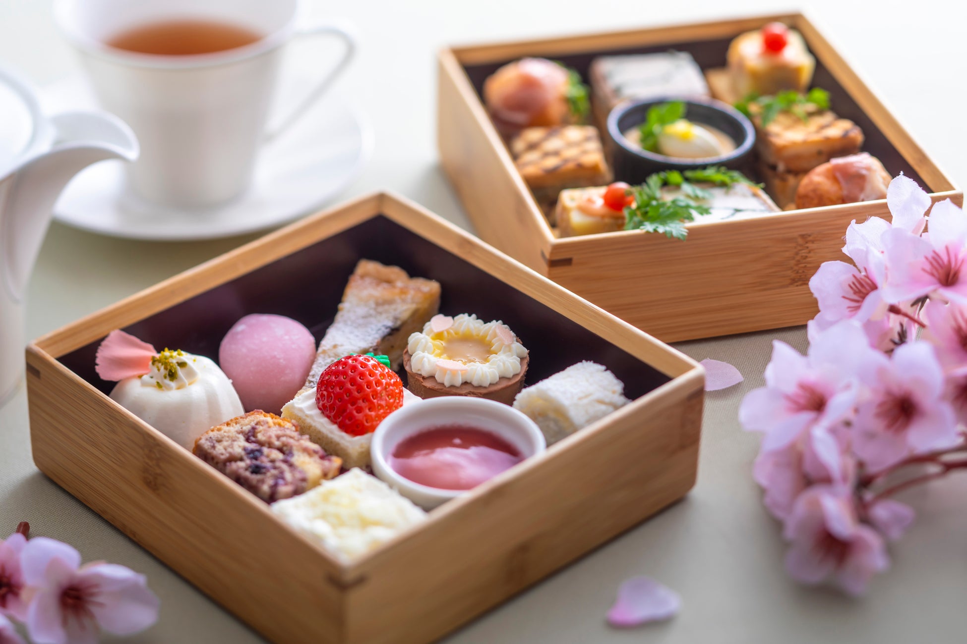 「スプリングアフタヌーンティーセット」は、春らしいやさしい色合いに包まれたスイーツ9種とセイボリー9品をご用意。苺ショートケーキや苺大福、柑橘のロールケーキなど、春の息吹を感じられるアフタヌーンティーセットです。