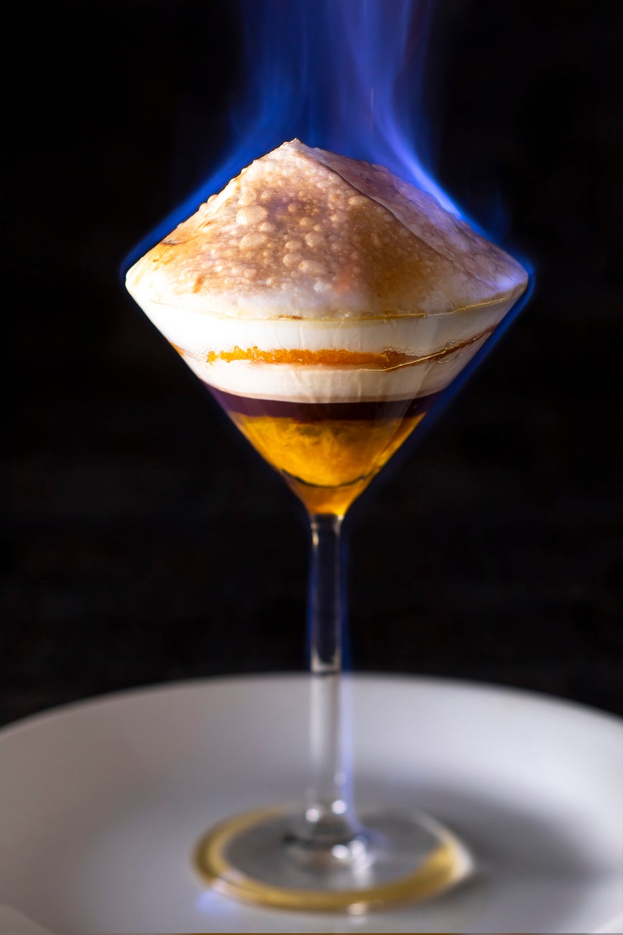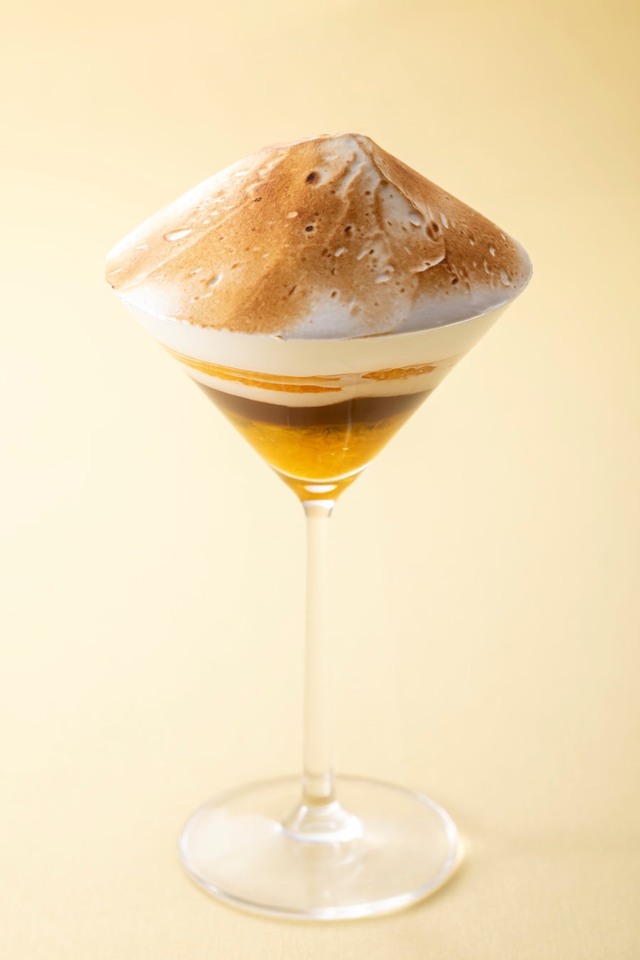 「柑橘とブリオッシュショコラのパフェ」はお酒を効かせたブリオッシュショコラと爽やかな柑橘の酸味が愉しめる大人味のパフェです。最後の仕上げとして目の前でフランベしたブランデーをかけ、真っ白なメレンゲが青い炎に包まれるライブパフォーマンスもお愉しみいただけます。