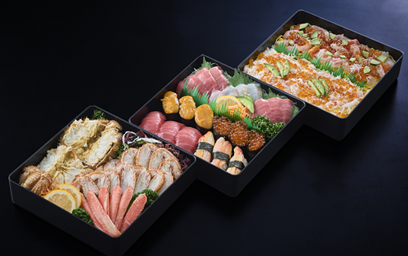 〈つきじ鈴富〉まぐろの卸問屋の本領発揮!まぐろ専門店だからこそ実現した天然まぐろ尽くしの三段重。「にぎり」はもちろん「ちらし」、そして揚げ物まで、まぐろを味わい尽くせます。