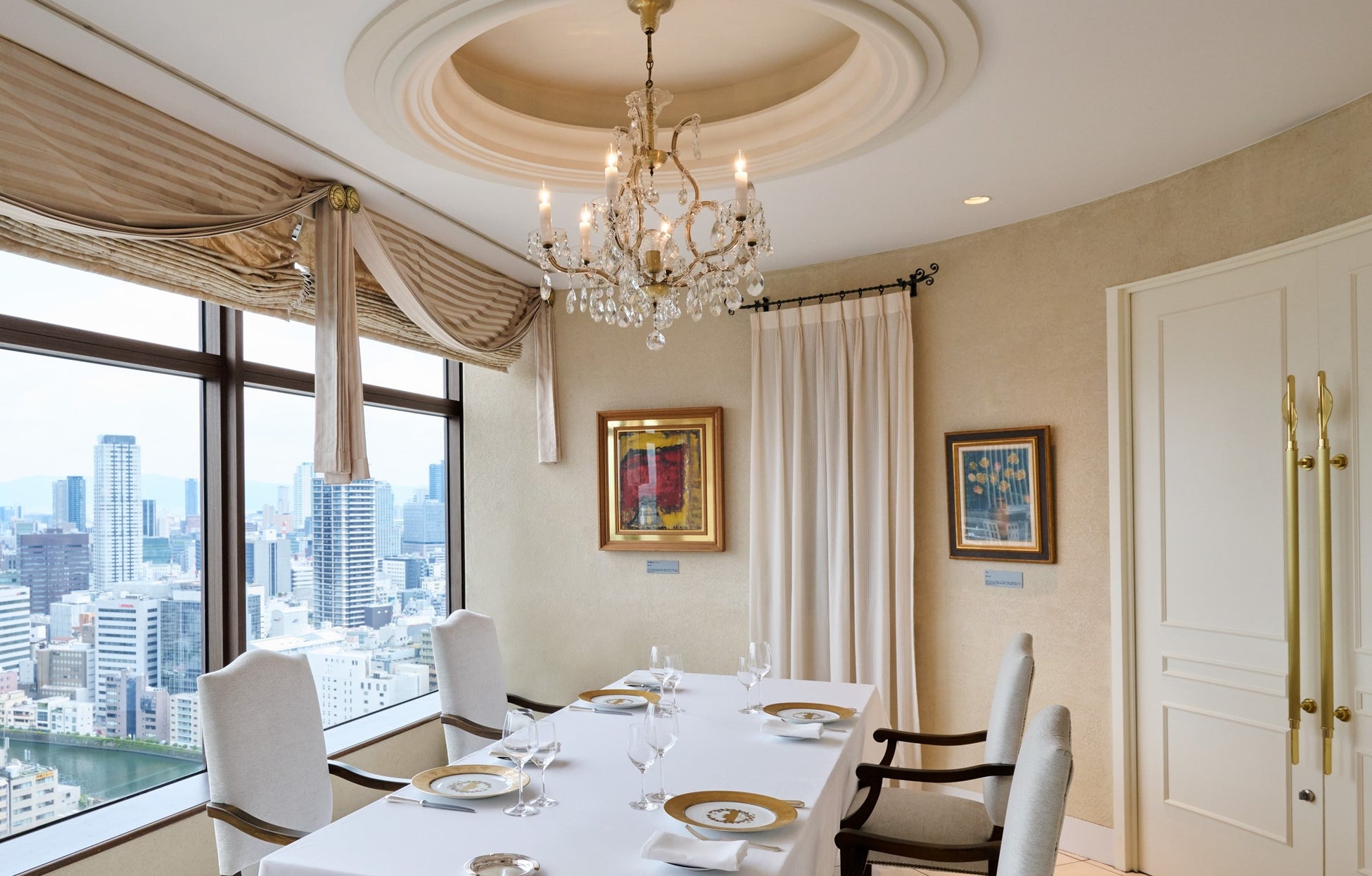 グランメゾン「レストラン シャンボール」では、春に旬を迎える優しい甘みの淡路島サクラマスや春野菜、桜色のデザートなど、春をイメージしたコースをご用意。華やかに彩る食前酒で始まり、プライベート感漂う個室で、ご家族水入らずのひとときをお過ごしいただけます。ホテル29階から望む大阪市街の眺めとともに、心尽くしのおもてなしと非日常感に包まれます。