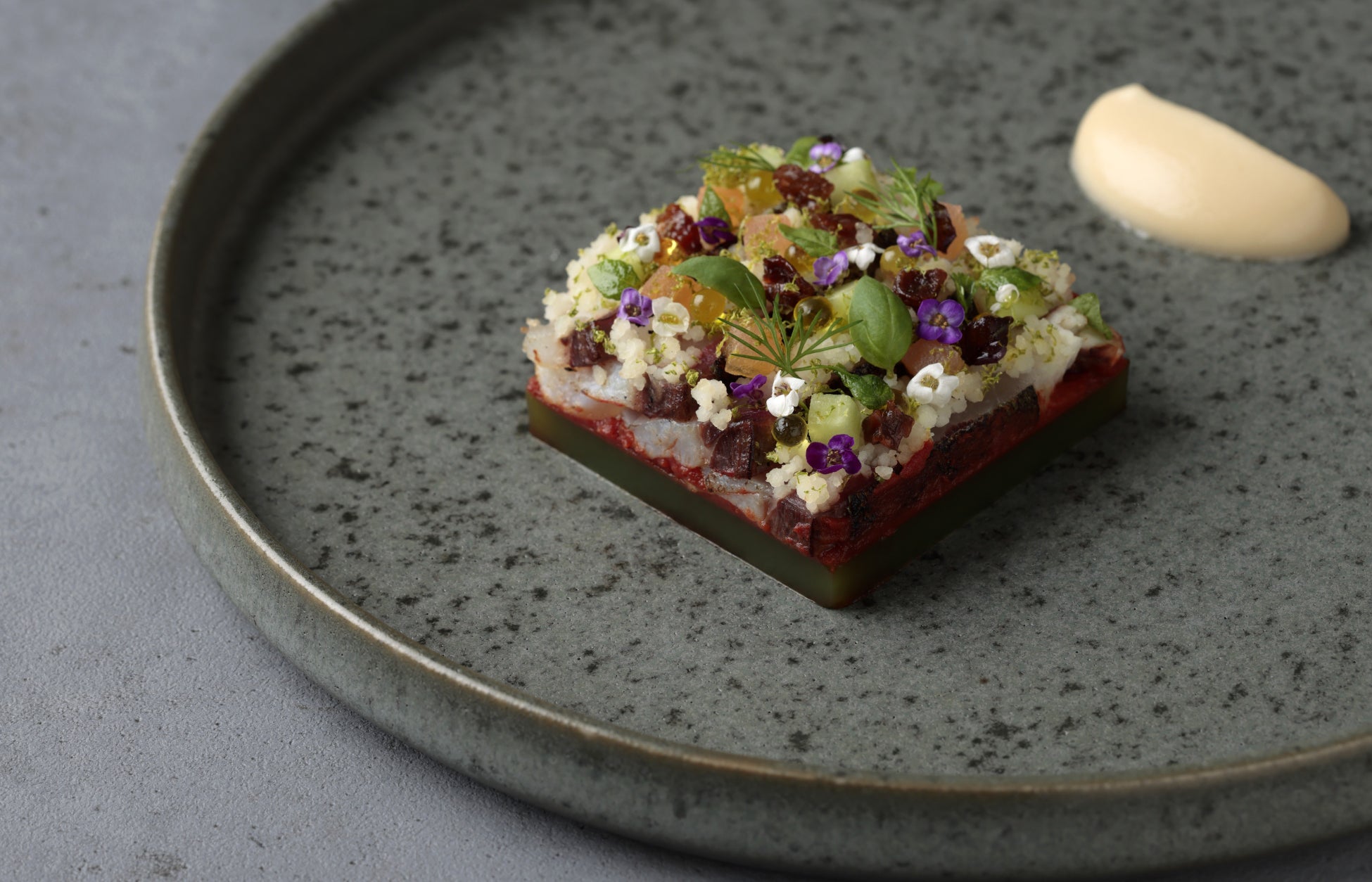 ・縞鯵と彩り野菜のタブレ 干しブドウと香草を散りばめて