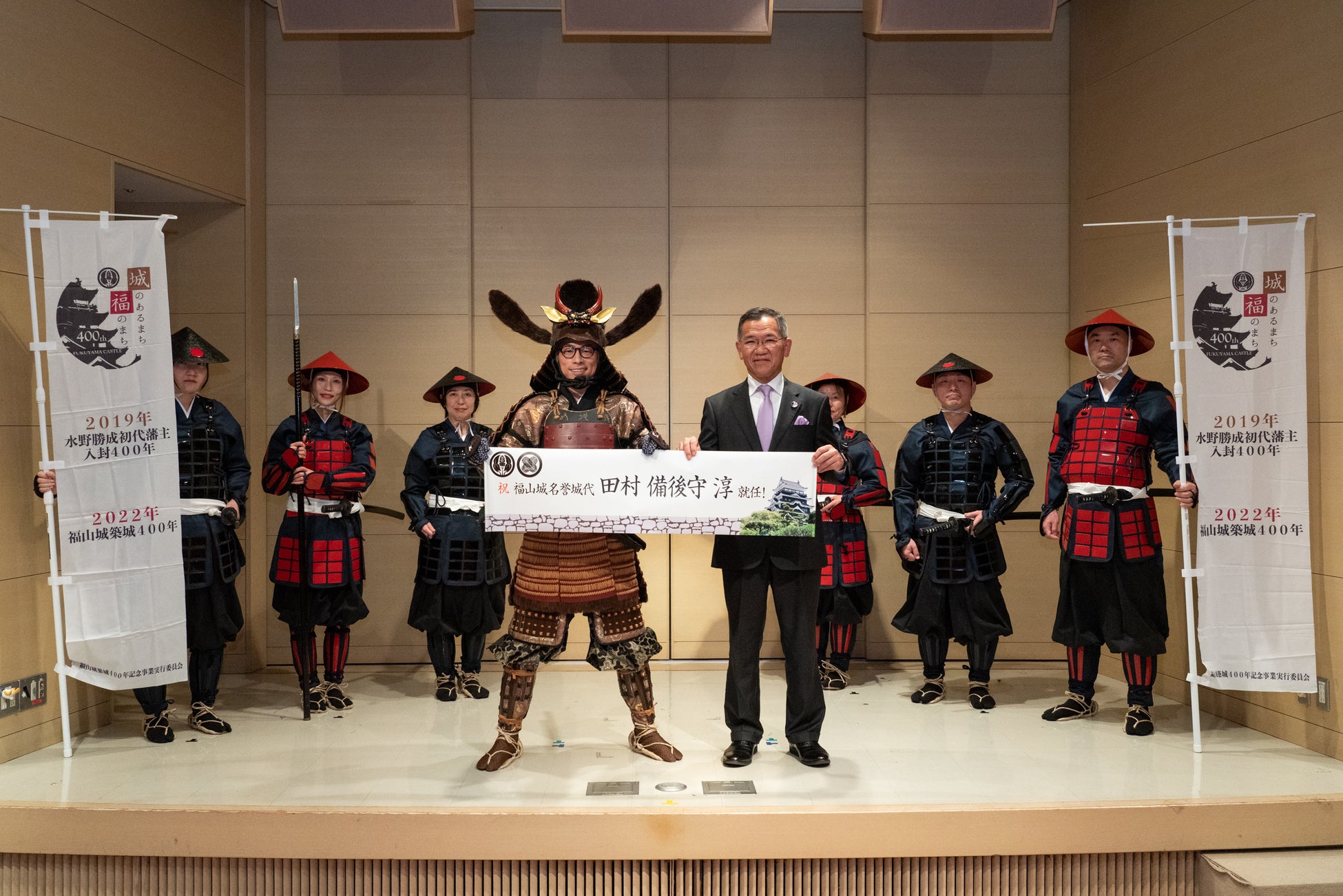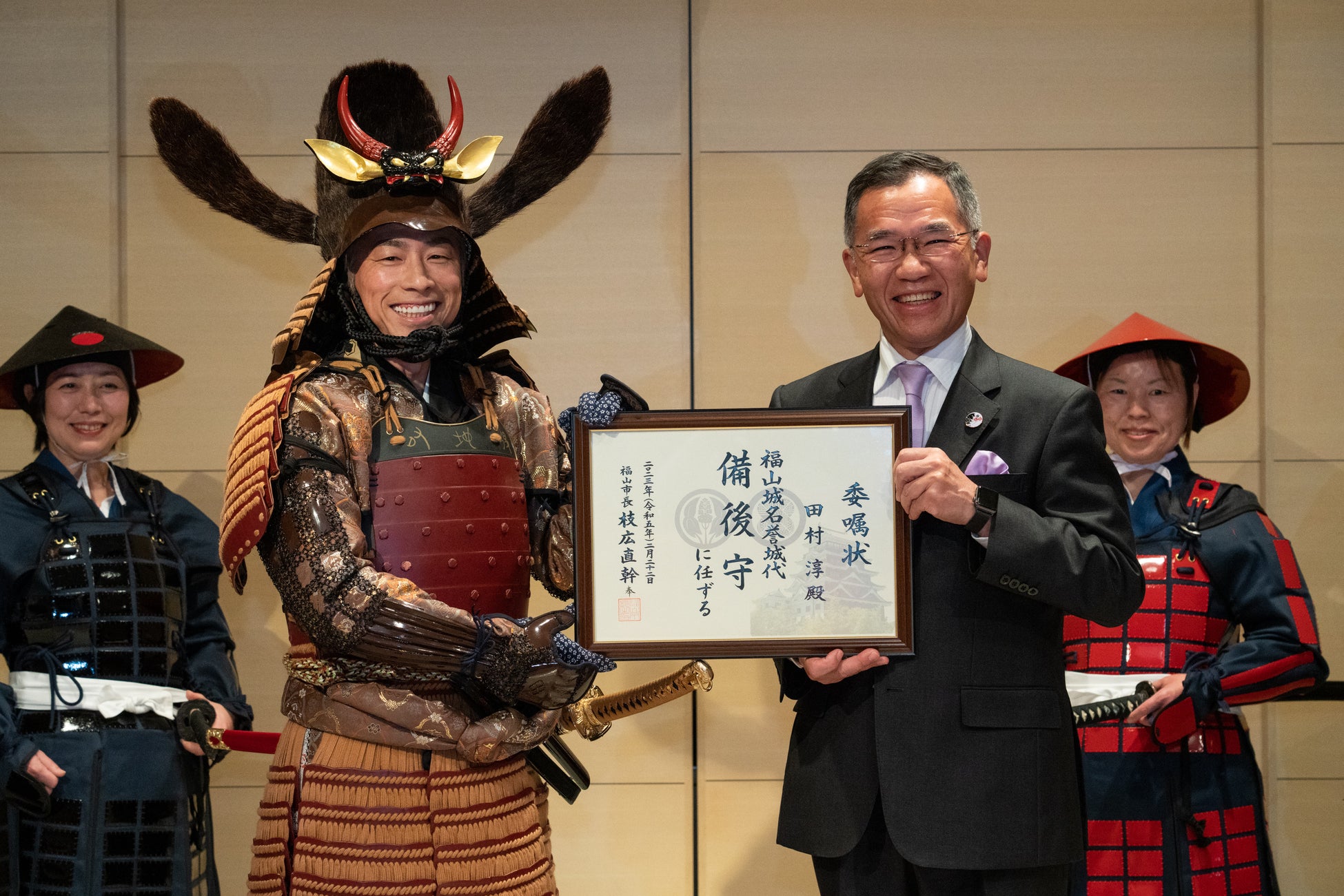 枝廣市長から「福山城名誉城代備後守(びんごのかみ)に任ずる」と委嘱状を手渡された田村は、犬山城のある犬山観光特使など、全国でさまざまな城の“応援隊”を務めており、「過去に僕がおすすめしたお城は観光客数が3倍にもふくれあがった。福山城にもたくさんの人に来てもらえるよう力を尽くしたい」と意気込む田村に、枝廣市長は「これまで寝ても覚めても福山城のことを考えていたが、これからは全て名誉城代にお任せしたい」と全幅の信頼を寄せていました。