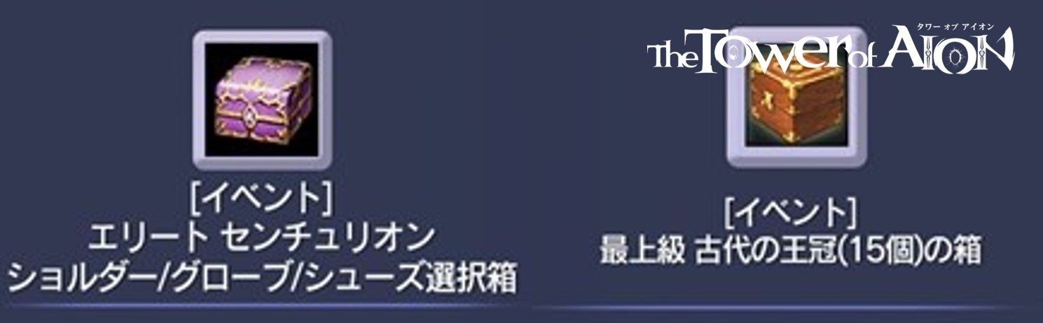 「[イベント]エリート センチュリオン ショルダー/グローブ/シューズ選択箱」または「[イベント]最上級 古代の王冠(15個)の箱」のいずれか1つを選択して入手できます。