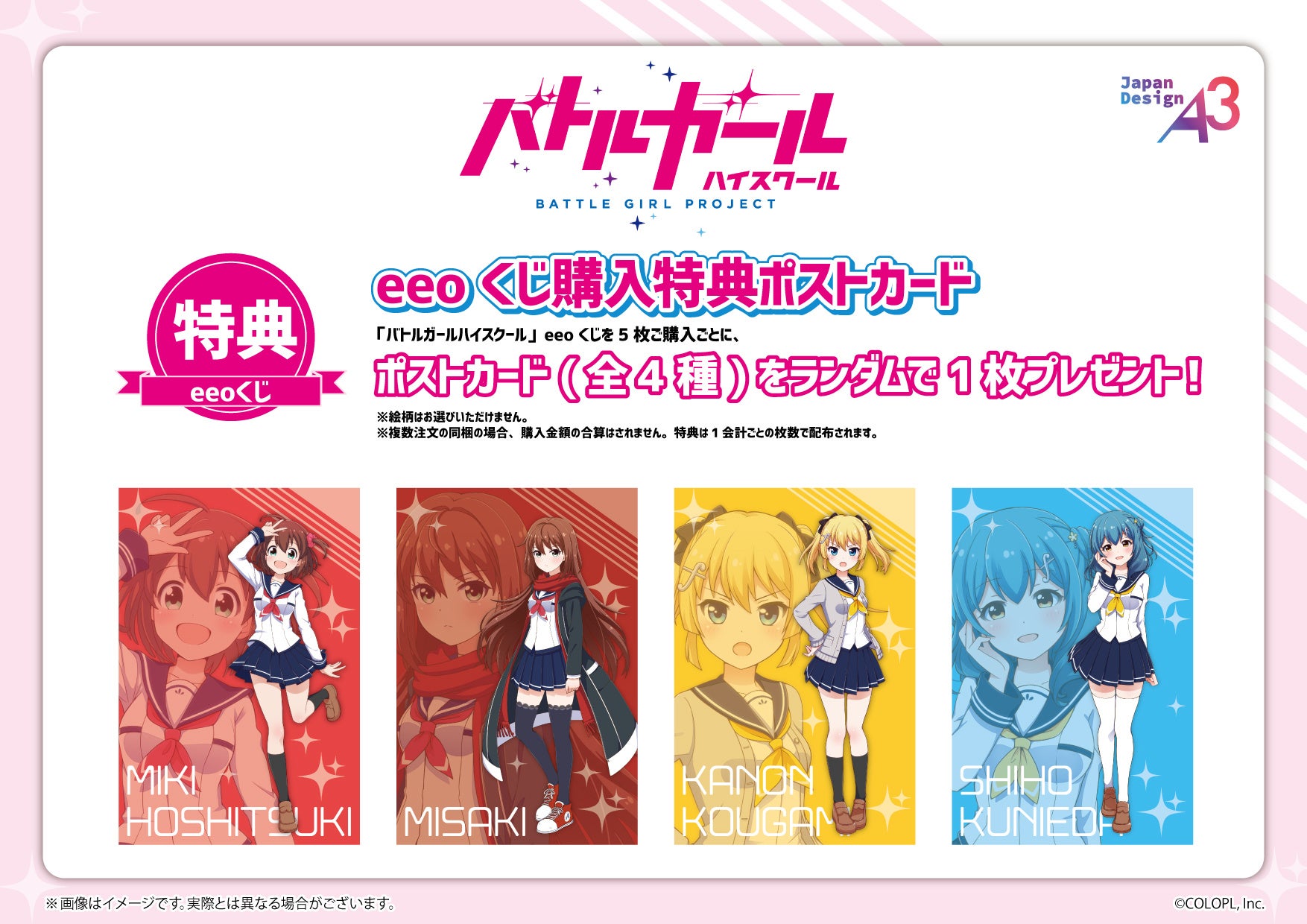 株式会社コロプラ(代表取締役社長 上席執行役員 CEO:宮本貴志、本社:東京都港区、以下「コロプラ」)は、美少女コンテンツ『バトルガール ハイスクール(以下、バトガ)』が2026年4月16日(木)に11周年を迎え、株式会社A3が運営する通販サイト「eeo Store online」にてオンラインくじの販売を開始したことをお知らせします。