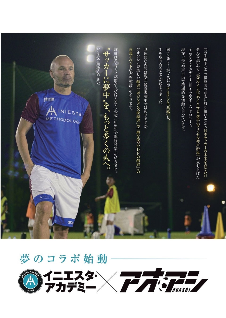 アンドレス・イニエスタ選手が大切にする価値観「献身、努力、向上心、情熱、協調性」は、『アオアシ』でも重要な価値観として描いてきました。この理念に共鳴し、「“サッカーに夢中”を、もっと多くの人へ。」をテーマに手を取り合うことが決まりました。具体的な内容については、今後スピリッツ誌面やアオアシ公式Twitterでの続報をお待ちください。
