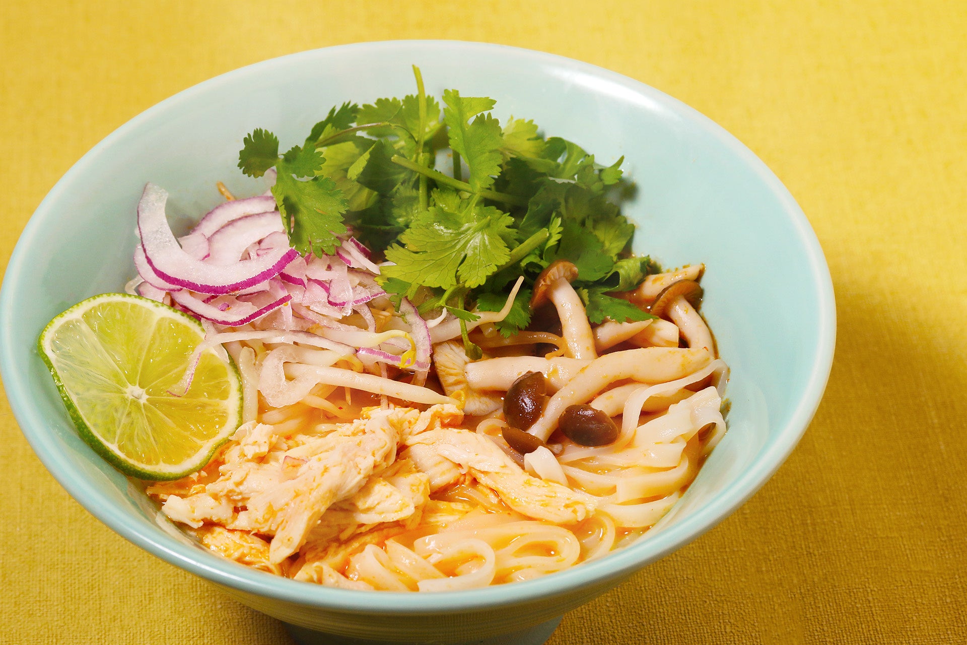 蒸し鶏のジューシーさとトムヤムクリームのまろやかな酸味が絶品。