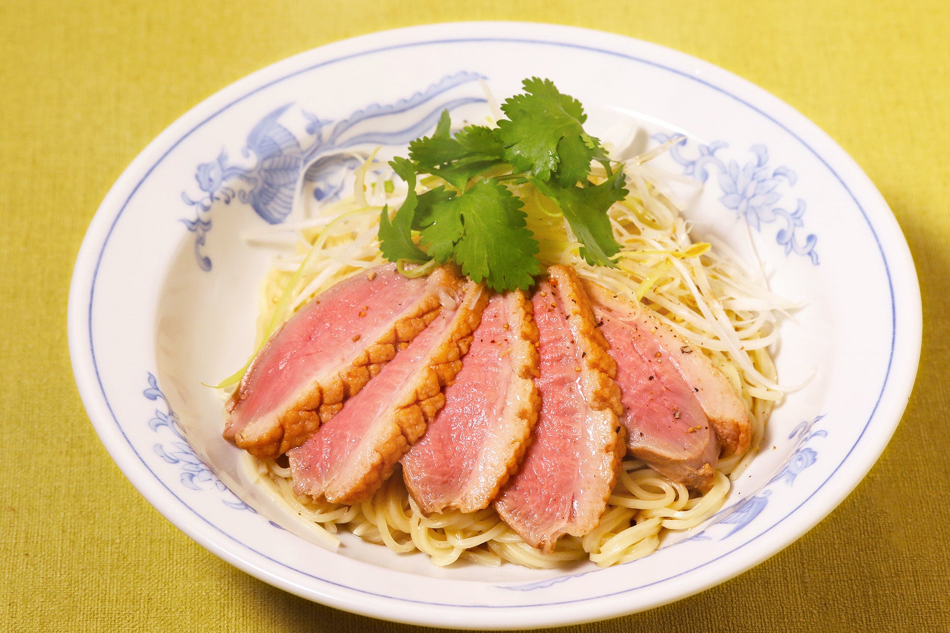 鴨肉とシャキシャキねぎが引き立つ上品な味わいの汁なしそば。