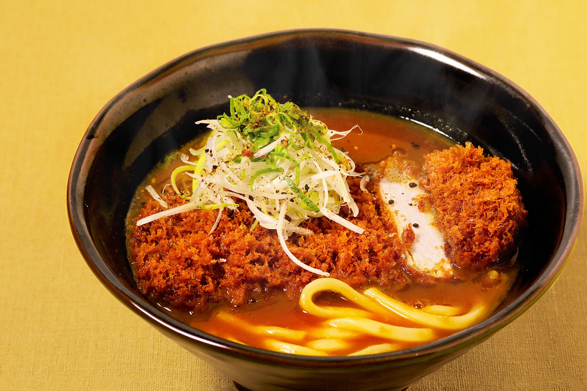 サクサクの三元豚カツとスパイシーなカレーが豪快に絡む満足感たっぷりのうどん。