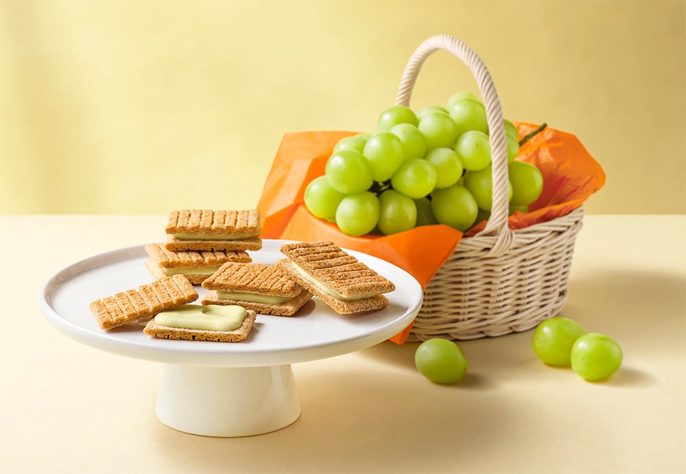 国産シャインマスカットの果汁を練りこんだミルキーなホワイトショコラ。みずみずしい国産シャインマスカット⾹る5種素材のシリアル⽣地でサンドしました。